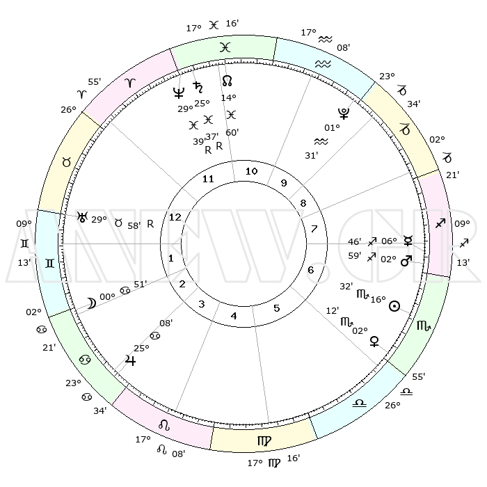 | | ΘΕΣΕΙΣ ΠΛΑΝΗΤΩΝ ΑΣΤΡΟΛΟΓΙΚΟΥ ΧΑΡΤΗ ΤΗΣ ΣΤΙΓΜΗΣ ΑΥΤΗΣ | | | | Πλανήτης | Ζώδιο | Μοίρες | Δεκαήμ. | Σε οίκο | Απόκλιση | | Ακμές των οίκων | | Ηλιος | Σκορπιός | 16°27' | Δεύτερο | 7 | 16 S 45 | | 1ος | 04°09' | Ταύρος | | Σελήνη | Δίδυμοι | 29°42' | Τρίτο | 3 | 28 N 22 | | 2ος | 05°14' | Δίδυμοι | | Ερμής | Τοξότης | 06°46' | Πρώτο | 8 | 23 S 55 | | 3ος | 28°23' | Δίδυμοι | | Αφροδίτη | Σκορπιός | 02°06' | Πρώτο | 6 | 10 S 56 | | 4ος | 20°06' | Καρκίνος | | Αρης | Τοξότης | 02°56' | Πρώτο | 7 | 21 S 12 | | 5ος | 14°56' | Λέων | | Δίας | Καρκίνος | 25°08' | Τρίτο | 4 | 21 N 12 | | 6ος | 18°29' | Παρθένος | | Κρόνος | Ιχθείς | 25°37'R | Τρίτο | 12 | 03 S 59 | | 7ος | 04°09' | Σκορπιός | | Ουρανός | Ταύρος | 29°58'R | Τρίτο | 1 | 19 N 56 | | 8ος | 05°14' | Τοξότης | | Ποσειδώνας | Ιχθείς | 29°39'R | Τρίτο | 12 | 01 S 24 | | 9ος | 28°23' | Τοξότης | | Πλούτωνας | Υδροχόος | 01°31' | Πρώτο | 10 | 23 S 30 | | 10ος | 20°06' | Αιγόκερως | | Β. Δεσμός | Ιχθείς | 14°60' | Δεύτερο | 11 | 05 S 55 | | 11ος | 14°56' | Υδροχόος | | Ωροσκόπος | Ταύρος | 04°09' | Πρώτο | | | 12ος | 18°29' | Ιχθείς | | Μεσουράνημα | Αιγόκερως | 20°06' | Τρίτο | | | |