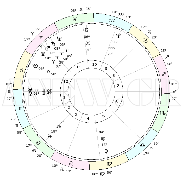 | | ΘΕΣΕΙΣ ΠΛΑΝΗΤΩΝ ΑΣΤΡΟΛΟΓΙΚΟΥ ΧΑΡΤΗ ΤΗΣ ΣΤΙΓΜΗΣ ΑΥΤΗΣ | | | | Πλανήτης | Ζώδιο | Μοίρες | Δεκαήμ. | Σε οίκο | Απόκλιση | | Ακμές των οίκων | | Ηλιος | Ταύρος | 06°55' | Πρώτο | 1 | 13 N 49 | | 1ος | 06°29' | Ταύρος | | Σελήνη | Παρθένος | 14°23' | Δεύτερο | 5 | 05 N 34 | | 2ος | 06°56' | Δίδυμοι | | Ερμής | Κριός | 19°01' | Δεύτερο | 12 | 05 N 20 | | 3ος | 29°52' | Δίδυμοι | | Αφροδίτη | Δίδυμοι | 03°38' | Πρώτο | 1 | 21 N 35 | | 4ος | 21°37' | Καρκίνος | | Αρης | Κριός | 13°26' | Δεύτερο | 12 | 04 N 27 | | 5ος | 16°42' | Λέων | | Δίας | Καρκίνος | 18°24' | Δεύτερο | 3 | 22 N 33 | | 6ος | 20°43' | Παρθένος | | Κρόνος | Κριός | 08°49' | Πρώτο | 12 | 01 N 30 | | 7ος | 06°28' | Σκορπιός | | Ουρανός | Δίδυμοι | 00°04' | Πρώτο | 1 | 20 N 00 | | 8ος | 06°56' | Τοξότης | | Ποσειδώνας | Κριός | 03°08' | Πρώτο | 12 | 00 N 02 | | 9ος | 29°52' | Τοξότης | | Πλούτωνας | Υδροχόος | 05°29' | Πρώτο | 10 | 22 S 48 | | 10ος | 21°37' | Αιγόκερως | | Β. Δεσμός | Ιχθείς | 06°01' | Πρώτο | 11 | 09 S 18 | | 11ος | 16°42' | Υδροχόος | | Ωροσκόπος | Ταύρος | 06°29' | Πρώτο | | | 12ος | 20°43' | Ιχθείς | | Μεσουράνημα | Αιγόκερως | 21°37' | Τρίτο | | | |