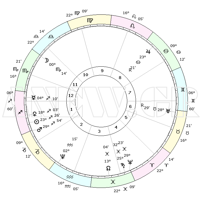 | | ΘΕΣΕΙΣ ΠΛΑΝΗΤΩΝ ΑΣΤΡΟΛΟΓΙΚΟΥ ΧΑΡΤΗ ΤΗΣ ΣΤΙΓΜΗΣ ΑΥΤΗΣ | | | | Πλανήτης | Ζώδιο | Μοίρες | Δεκαήμ. | Σε οίκο | Απόκλιση | | Ακμές των οίκων | | Ηλιος | Τοξότης | 22°54' | Τρίτο | 6 | 23 S 15 | | 1ος | 01°50' | Καρκίνος | | Σελήνη | Ζυγός | 23°58' | Τρίτο | 5 | 12 S 21 | | 2ος | 22°31' | Καρκίνος | | Ερμής | Τοξότης | 03°28' | Πρώτο | 6 | 19 S 17 | | 3ος | 14°27' | Λέων | | Αφροδίτη | Τοξότης | 17°23' | Δεύτερο | 6 | 22 S 39 | | 4ος | 11°04' | Παρθένος | | Αρης | Τοξότης | 29°31' | Τρίτο | 6 | 24 S 12 | | 5ος | 15°17' | Ζυγός | | Δίας | Καρκίνος | 23°24'R | Τρίτο | 2 | 21 N 36 | | 6ος | 25°09' | Σκορπιός | | Κρόνος | Ιχθείς | 25°31' | Τρίτο | 10 | 03 S 55 | | 7ος | 01°50' | Αιγόκερως | | Ουρανός | Ταύρος | 28°31'R | Τρίτο | 12 | 19 N 38 | | 8ος | 22°31' | Αιγόκερως | | Ποσειδώνας | Ιχθείς | 29°23' | Τρίτο | 10 | 01 S 29 | | 9ος | 14°27' | Υδροχόος | | Πλούτωνας | Υδροχόος | 02°14' | Πρώτο | 8 | 23 S 20 | | 10ος | 11°04' | Ιχθείς | | Β. Δεσμός | Ιχθείς | 13°05' | Δεύτερο | 10 | 06 S 39 | | 11ος | 15°17' | Κριός | | Ωροσκόπος | Καρκίνος | 01°50' | Πρώτο | | | 12ος | 25°09' | Ταύρος | | Μεσουράνημα | Ιχθείς | 11°04' | Δεύτερο | | | |