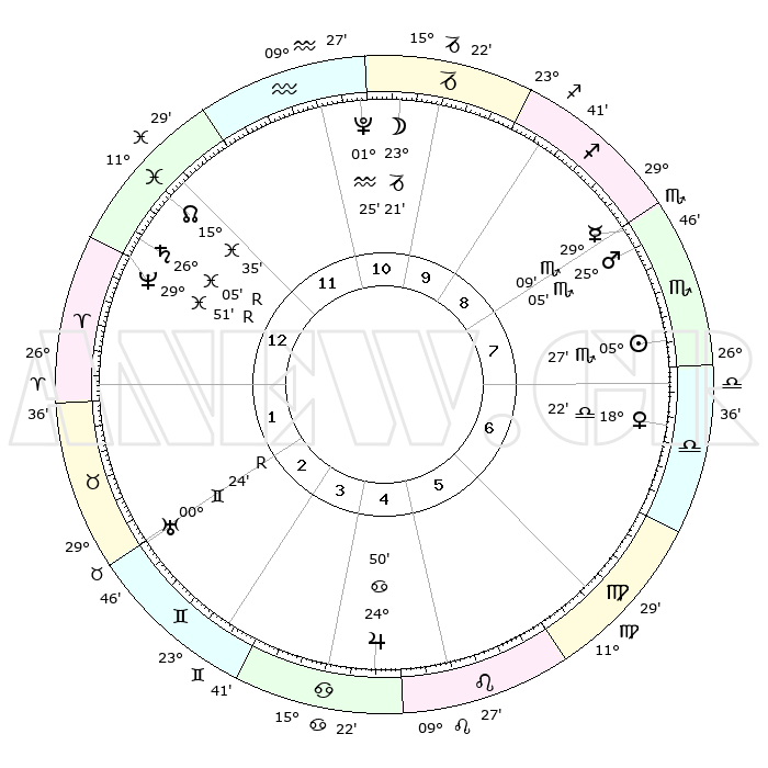 | | ΘΕΣΕΙΣ ΠΛΑΝΗΤΩΝ ΑΣΤΡΟΛΟΓΙΚΟΥ ΧΑΡΤΗ ΤΗΣ ΣΤΙΓΜΗΣ ΑΥΤΗΣ | | | | Πλανήτης | Ζώδιο | Μοίρες | Δεκαήμ. | Σε οίκο | Απόκλιση | | Ακμές των οίκων | | Ηλιος | Σκορπιός | 05°03' | Πρώτο | 12 | 13 S 12 | | 1ος | 13°34' | Σκορπιός | | Σελήνη | Αιγόκερως | 18°29' | Δεύτερο | 3 | 26 S 30 | | 2ος | 12°55' | Τοξότης | | Ερμής | Σκορπιός | 28°43' | Τρίτο | 1 | 22 S 36 | | 3ος | 16°14' | Αιγόκερως | | Αφροδίτη | Ζυγός | 17°52' | Δεύτερο | 11 | 05 S 37 | | 4ος | 21°24' | Υδροχόος | | Αρης | Σκορπιός | 24°48' | Τρίτο | 1 | 19 S 19 | | 5ος | 23°54' | Ιχθείς | | Δίας | Καρκίνος | 24°49' | Τρίτο | 9 | 21 N 14 | | 6ος | 21°07' | Κριός | | Κρόνος | Ιχθείς | 26°06'R | Τρίτο | 5 | 03 S 49 | | 7ος | 13°34' | Ταύρος | | Ουρανός | Δίδυμοι | 00°25'R | Πρώτο | 7 | 20 N 02 | | 8ος | 12°55' | Δίδυμοι | | Ποσειδώνας | Ιχθείς | 29°52'R | Τρίτο | 5 | 01 S 19 | | 9ος | 16°14' | Καρκίνος | | Πλούτωνας | Υδροχόος | 01°25' | Πρώτο | 3 | 23 S 31 | | 10ος | 21°24' | Λέων | | Β. Δεσμός | Ιχθείς | 15°36' | Δεύτερο | 4 | 05 S 41 | | 11ος | 23°54' | Παρθένος | | Ωροσκόπος | Σκορπιός | 13°34' | Δεύτερο | | | 12ος | 21°07' | Ζυγός | | Μεσουράνημα | Λέων | 21°24' | Τρίτο | | | |