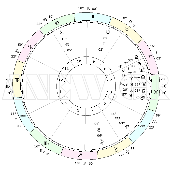 | | ΘΕΣΕΙΣ ΠΛΑΝΗΤΩΝ ΑΣΤΡΟΛΟΓΙΚΟΥ ΧΑΡΤΗ ΤΗΣ ΣΤΙΓΜΗΣ ΑΥΤΗΣ | | | | Πλανήτης | Ζώδιο | Μοίρες | Δεκαήμ. | Σε οίκο | Απόκλιση | | Ακμές των οίκων | | Ηλιος | Ιχθείς | 22°02' | Τρίτο | 7 | 03 S 10 | | 1ος | 29°53' | Λέων | | Σελήνη | Αιγόκερως | 05°14' | Πρώτο | 5 | 28 S 03 | | 2ος | 23°44' | Παρθένος | | Ερμής | Ιχθείς | 11°57'R | Δεύτερο | 7 | 04 S 22 | | 3ος | 22°24' | Ζυγός | | Αφροδίτη | Κριός | 07°40' | Πρώτο | 8 | 02 N 01 | | 4ος | 25°18' | Σκορπιός | | Αρης | Ιχθείς | 07°54' | Πρώτο | 7 | 09 S 37 | | 5ος | 29°30' | Τοξότης | | Δίας | Καρκίνος | 15°05' | Δεύτερο | 11 | 22 N 56 | | 6ος | 01°28' | Υδροχόος | | Κρόνος | Κριός | 03°15' | Πρώτο | 8 | 00 S 40 | | 7ος | 29°53' | Υδροχόος | | Ουρανός | Ταύρος | 28°02' | Τρίτο | 10 | 19 N 33 | | 8ος | 23°44' | Ιχθείς | | Ποσειδώνας | Κριός | 01°29' | Πρώτο | 8 | 00 S 37 | | 9ος | 22°24' | Κριός | | Πλούτωνας | Υδροχόος | 04°50' | Πρώτο | 6 | 22 S 50 | | 10ος | 25°18' | Ταύρος | | Β. Δεσμός | Ιχθείς | 08°26' | Πρώτο | 7 | 08 S 24 | | 11ος | 29°30' | Δίδυμοι | | Ωροσκόπος | Λέων | 29°53' | Τρίτο | | | 12ος | 01°28' | Λέων | | Μεσουράνημα | Ταύρος | 25°18' | Τρίτο | | | |