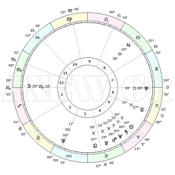 | | ΘΕΣΕΙΣ ΠΛΑΝΗΤΩΝ ΑΣΤΡΟΛΟΓΙΚΟΥ ΧΑΡΤΗ ΤΗΣ ΣΤΙΓΜΗΣ ΑΥΤΗΣ | | | | Πλανήτης | Ζώδιο | Μοίρες | Δεκαήμ. | Σε οίκο | Απόκλιση | | Ακμές των οίκων | | Ηλιος | Κριός | 16°00' | Δεύτερο | 5 | 06 N 18 | | 1ος | 11°47' | Σκορπιός | | Σελήνη | Σκορπιός | 27°43' | Τρίτο | 1 | 24 S 35 | | 2ος | 10°59' | Τοξότης | | Ερμής | Ιχθείς | 18°19' | Δεύτερο | 4 | 06 S 24 | | 3ος | 14°05' | Αιγόκερως | | Αφροδίτη | Ταύρος | 07°32' | Πρώτο | 6 | 13 N 48 | | 4ος | 19°08' | Υδροχόος | | Αρης | Ιχθείς | 26°52' | Τρίτο | 5 | 02 S 11 | | 5ος | 21°43' | Ιχθείς | | Δίας | Καρκίνος | 16°08' | Δεύτερο | 9 | 22 N 50 | | 6ος | 19°09' | Κριός | | Κρόνος | Κριός | 06°15' | Πρώτο | 5 | 00 N 31 | | 7ος | 11°47' | Ταύρος | | Ουρανός | Ταύρος | 28°59' | Τρίτο | 7 | 19 N 46 | | 8ος | 10°59' | Δίδυμοι | | Ποσειδώνας | Κριός | 02°23' | Πρώτο | 5 | 00 S 15 | | 9ος | 14°05' | Καρκίνος | | Πλούτωνας | Υδροχόος | 05°17' | Πρώτο | 3 | 22 S 47 | | 10ος | 19°08' | Λέων | | Β. Δεσμός | Ιχθείς | 07°09' | Πρώτο | 4 | 08 S 53 | | 11ος | 21°43' | Παρθένος | | Ωροσκόπος | Σκορπιός | 11°47' | Δεύτερο | | | 12ος | 19°09' | Ζυγός | | Μεσουράνημα | Λέων | 19°08' | Δεύτερο | | | |
