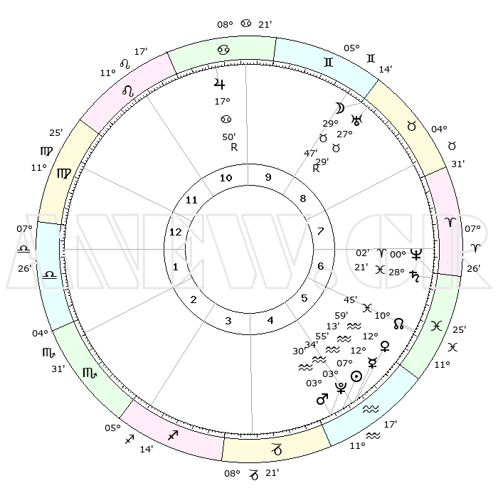 | | ΘΕΣΕΙΣ ΠΛΑΝΗΤΩΝ ΑΣΤΡΟΛΟΓΙΚΟΥ ΧΑΡΤΗ ΤΗΣ ΣΤΙΓΜΗΣ ΑΥΤΗΣ | | | | Πλανήτης | Ζώδιο | Μοίρες | Δεκαήμ. | Σε οίκο | Απόκλιση | | Ακμές των οίκων | | Ηλιος | Υδροχόος | 07°51' | Πρώτο | 5 | 18 S 18 | | 1ος | 17°59' | Παρθένος | | Σελήνη | Ταύρος | 28°50' | Τρίτο | 9 | 24 N 53 | | 2ος | 13°36' | Ζυγός | | Ερμής | Υδροχόος | 12°06' | Δεύτερο | 5 | 19 S 08 | | 3ος | 13°31' | Σκορπιός | | Αφροδίτη | Υδροχόος | 12°54' | Δεύτερο | 5 | 18 S 10 | | 4ος | 16°27' | Τοξότης | | Αρης | Υδροχόος | 03°27' | Πρώτο | 5 | 20 S 23 | | 5ος | 19°42' | Αιγόκερως | | Δίας | Καρκίνος | 17°51'R | Δεύτερο | 10 | 22 N 32 | | 6ος | 20°36' | Υδροχόος | | Κρόνος | Ιχθείς | 28°21' | Τρίτο | 7 | 02 S 40 | | 7ος | 17°59' | Ιχθείς | | Ουρανός | Ταύρος | 27°29'R | Τρίτο | 9 | 19 N 24 | | 8ος | 13°36' | Κριός | | Ποσειδώνας | Κριός | 00°02' | Πρώτο | 7 | 01 S 12 | | 9ος | 13°31' | Ταύρος | | Πλούτωνας | Υδροχόος | 03°34' | Πρώτο | 5 | 23 S 03 | | 10ος | 16°27' | Δίδυμοι | | Β. Δεσμός | Ιχθείς | 10°45' | Δεύτερο | 6 | 07 S 32 | | 11ος | 19°42' | Καρκίνος | | Ωροσκόπος | Παρθένος | 17°59' | Δεύτερο | | | 12ος | 20°36' | Λέων | | Μεσουράνημα | Δίδυμοι | 16°27' | Δεύτερο | | | |