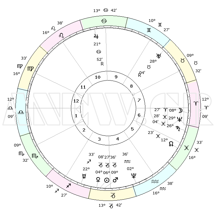 | | ΘΕΣΕΙΣ ΠΛΑΝΗΤΩΝ ΑΣΤΡΟΛΟΓΙΚΟΥ ΧΑΡΤΗ ΤΗΣ ΣΤΙΓΜΗΣ ΑΥΤΗΣ | | | | Πλανήτης | Ζώδιο | Μοίρες | Δεκαήμ. | Σε οίκο | Απόκλιση | | Ακμές των οίκων | | Ηλιος | Αιγόκερως | 06°22' | Πρώτο | 4 | 23 S 17 | | 1ος | 19°38' | Παρθένος | | Σελήνη | Κριός | 07°24' | Πρώτο | 7 | 05 N 00 | | 2ος | 15°24' | Ζυγός | | Ερμής | Τοξότης | 22°26' | Τρίτο | 4 | 23 S 19 | | 3ος | 15°24' | Σκορπιός | | Αφροδίτη | Αιγόκερως | 04°02' | Πρώτο | 4 | 23 S 43 | | 4ος | 18°20' | Τοξότης | | Αρης | Αιγόκερως | 09°33' | Πρώτο | 4 | 23 S 57 | | 5ος | 21°31' | Αιγόκερως | | Δίας | Καρκίνος | 21°53'R | Τρίτο | 11 | 21 N 53 | | 6ος | 22°22' | Υδροχόος | | Κρόνος | Ιχθείς | 26°04' | Τρίτο | 7 | 03 S 39 | | 7ος | 19°38' | Ιχθείς | | Ουρανός | Ταύρος | 28°04'R | Τρίτο | 9 | 19 N 32 | | 8ος | 15°24' | Κριός | | Ποσειδώνας | Ιχθείς | 29°28' | Τρίτο | 7 | 01 S 26 | | 9ος | 15°24' | Ταύρος | | Πλούτωνας | Υδροχόος | 02°36' | Πρώτο | 5 | 23 S 15 | | 10ος | 18°20' | Δίδυμοι | | Β. Δεσμός | Ιχθείς | 12°23' | Δεύτερο | 6 | 06 S 55 | | 11ος | 21°31' | Καρκίνος | | Ωροσκόπος | Παρθένος | 19°38' | Δεύτερο | | | 12ος | 22°22' | Λέων | | Μεσουράνημα | Δίδυμοι | 18°20' | Δεύτερο | | | |