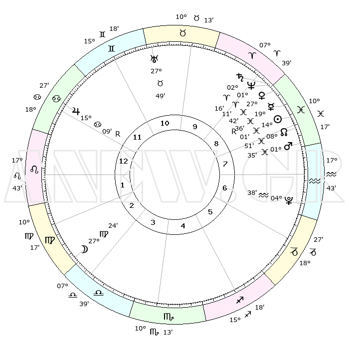 | | ΘΕΣΕΙΣ ΠΛΑΝΗΤΩΝ ΑΣΤΡΟΛΟΓΙΚΟΥ ΧΑΡΤΗ ΤΗΣ ΣΤΙΓΜΗΣ ΑΥΤΗΣ | | | | Πλανήτης | Ζώδιο | Μοίρες | Δεκαήμ. | Σε οίκο | Απόκλιση | | Ακμές των οίκων | | Ηλιος | Ιχθείς | 13°57' | Δεύτερο | 8 | 06 S 19 | | 1ος | 01°12' | Λέων | | Σελήνη | Παρθένος | 26°40' | Τρίτο | 3 | 00 S 09 | | 2ος | 22°19' | Λέων | | Ερμής | Ιχθείς | 19°39'R | Δεύτερο | 9 | 00 S 44 | | 3ος | 17°31' | Παρθένος | | Αφροδίτη | Ιχθείς | 27°37' | Τρίτο | 9 | 02 S 08 | | 4ος | 18°42' | Ζυγός | | Αρης | Ιχθείς | 01°32' | Πρώτο | 8 | 11 S 57 | | 5ος | 24°43' | Σκορπιός | | Δίας | Καρκίνος | 15°09'R | Δεύτερο | 12 | 22 N 55 | | 6ος | 00°14' | Αιγόκερως | | Κρόνος | Κριός | 02°16' | Πρώτο | 9 | 01 S 03 | | 7ος | 01°12' | Υδροχόος | | Ουρανός | Ταύρος | 27°49' | Τρίτο | 11 | 19 N 30 | | 8ος | 22°19' | Υδροχόος | | Ποσειδώνας | Κριός | 01°11' | Πρώτο | 9 | 00 S 44 | | 9ος | 17°31' | Ιχθείς | | Πλούτωνας | Υδροχόος | 04°38' | Πρώτο | 7 | 22 S 52 | | 10ος | 18°42' | Κριός | | Β. Δεσμός | Ιχθείς | 08°51' | Πρώτο | 8 | 08 S 15 | | 11ος | 24°43' | Ταύρος | | Ωροσκόπος | Λέων | 01°12' | Πρώτο | | | 12ος | 00°14' | Καρκίνος | | Μεσουράνημα | Κριός | 18°42' | Δεύτερο | | | |