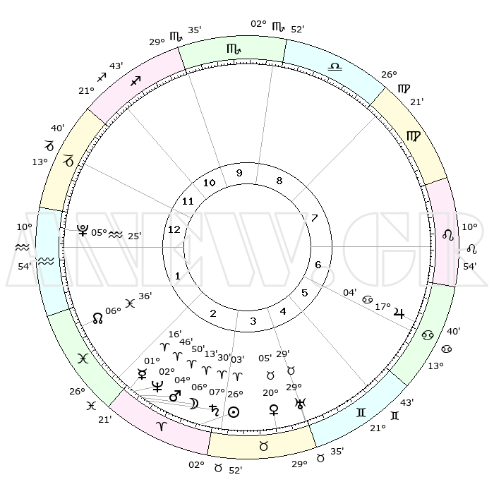 | | ΘΕΣΕΙΣ ΠΛΑΝΗΤΩΝ ΑΣΤΡΟΛΟΓΙΚΟΥ ΧΑΡΤΗ ΤΗΣ ΣΤΙΓΜΗΣ ΑΥΤΗΣ | | | | Πλανήτης | Ζώδιο | Μοίρες | Δεκαήμ. | Σε οίκο | Απόκλιση | | Ακμές των οίκων | | Ηλιος | Κριός | 25°59' | Τρίτο | 3 | 10 N 02 | | 1ος | 11°19' | Αιγόκερως | | Σελήνη | Κριός | 05°12' | Πρώτο | 3 | 04 N 13 | | 2ος | 21°21' | Υδροχόος | | Ερμής | Κριός | 01°10' | Πρώτο | 2 | 01 S 56 | | 3ος | 01°37' | Κριός | | Αφροδίτη | Ταύρος | 19°60' | Δεύτερο | 4 | 17 N 57 | | 4ος | 03°33' | Ταύρος | | Αρης | Κριός | 04°47' | Πρώτο | 3 | 01 N 00 | | 5ος | 28°13' | Ταύρος | | Δίας | Καρκίνος | 17°04' | Δεύτερο | 7 | 22 N 43 | | 6ος | 19°31' | Δίδυμοι | | Κρόνος | Κριός | 07°30' | Πρώτο | 3 | 01 N 00 | | 7ος | 11°19' | Καρκίνος | | Ουρανός | Ταύρος | 29°28' | Τρίτο | 5 | 19 N 52 | | 8ος | 21°21' | Λέων | | Ποσειδώνας | Κριός | 02°45' | Πρώτο | 3 | 00 S 06 | | 9ος | 01°37' | Ζυγός | | Πλούτωνας | Υδροχόος | 05°25' | Πρώτο | 1 | 22 S 47 | | 10ος | 03°33' | Σκορπιός | | Β. Δεσμός | Ιχθείς | 06°37' | Πρώτο | 2 | 09 S 05 | | 11ος | 28°13' | Σκορπιός | | Ωροσκόπος | Αιγόκερως | 11°19' | Δεύτερο | | | 12ος | 19°31' | Τοξότης | | Μεσουράνημα | Σκορπιός | 03°33' | Πρώτο | | | |