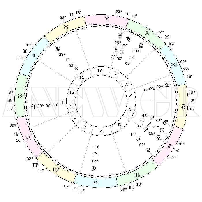 | | ΘΕΣΕΙΣ ΠΛΑΝΗΤΩΝ ΑΣΤΡΟΛΟΓΙΚΟΥ ΧΑΡΤΗ ΤΗΣ ΣΤΙΓΜΗΣ ΑΥΤΗΣ | | | | Πλανήτης | Ζώδιο | Μοίρες | Δεκαήμ. | Σε οίκο | Απόκλιση | | Ακμές των οίκων | | Ηλιος | Τοξότης | 21°04' | Τρίτο | 4 | 23 S 08 | | 1ος | 27°54' | Λέων | | Σελήνη | Ζυγός | 02°11' | Πρώτο | 2 | 02 S 23 | | 2ος | 21°32' | Παρθένος | | Ερμής | Τοξότης | 01°08' | Πρώτο | 4 | 18 S 37 | | 3ος | 20°00' | Ζυγός | | Αφροδίτη | Τοξότης | 15°07' | Δεύτερο | 4 | 22 S 21 | | 4ος | 22°54' | Σκορπιός | | Αρης | Τοξότης | 28°09' | Τρίτο | 5 | 24 S 11 | | 5ος | 27°14' | Τοξότης | | Δίας | Καρκίνος | 23°35'R | Τρίτο | 11 | 21 N 34 | | 6ος | 29°21' | Αιγόκερως | | Κρόνος | Ιχθείς | 25°28' | Τρίτο | 8 | 03 S 56 | | 7ος | 27°54' | Υδροχόος | | Ουρανός | Ταύρος | 28°35'R | Τρίτο | 10 | 19 N 38 | | 8ος | 21°32' | Ιχθείς | | Ποσειδώνας | Ιχθείς | 29°22' | Τρίτο | 8 | 01 S 29 | | 9ος | 20°00' | Κριός | | Πλούτωνας | Υδροχόος | 02°11' | Πρώτο | 6 | 23 S 20 | | 10ος | 22°54' | Ταύρος | | Β. Δεσμός | Ιχθείς | 13°11' | Δεύτερο | 7 | 06 S 36 | | 11ος | 27°14' | Δίδυμοι | | Ωροσκόπος | Λέων | 27°54' | Τρίτο | | | 12ος | 29°21' | Καρκίνος | | Μεσουράνημα | Ταύρος | 22°54' | Τρίτο | | | |