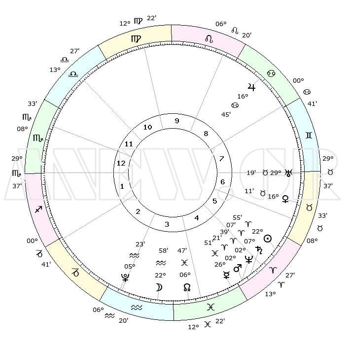 | | ΘΕΣΕΙΣ ΠΛΑΝΗΤΩΝ ΑΣΤΡΟΛΟΓΙΚΟΥ ΧΑΡΤΗ ΤΗΣ ΣΤΙΓΜΗΣ ΑΥΤΗΣ | | | | Πλανήτης | Ζώδιο | Μοίρες | Δεκαήμ. | Σε οίκο | Απόκλιση | | Ακμές των οίκων | | Ηλιος | Κριός | 22°51' | Τρίτο | 6 | 08 N 53 | | 1ος | 08°28' | Σκορπιός | | Σελήνη | Υδροχόος | 22°02' | Τρίτο | 4 | 15 S 31 | | 2ος | 07°26' | Τοξότης | | Ερμής | Ιχθείς | 26°45' | Τρίτο | 5 | 03 S 35 | | 3ος | 10°09' | Αιγόκερως | | Αφροδίτη | Ταύρος | 16°05' | Δεύτερο | 7 | 16 N 43 | | 4ος | 14°57' | Υδροχόος | | Αρης | Κριός | 02°18' | Πρώτο | 5 | 00 N 00 | | 5ος | 17°41' | Ιχθείς | | Δίας | Καρκίνος | 16°44' | Δεύτερο | 9 | 22 N 46 | | 6ος | 15°30' | Κριός | | Κρόνος | Κριός | 07°07' | Πρώτο | 5 | 00 N 51 | | 7ος | 08°28' | Ταύρος | | Ουρανός | Ταύρος | 29°19' | Τρίτο | 7 | 19 N 50 | | 8ος | 07°26' | Δίδυμοι | | Ποσειδώνας | Κριός | 02°39' | Πρώτο | 5 | 00 S 09 | | 9ος | 10°09' | Καρκίνος | | Πλούτωνας | Υδροχόος | 05°23' | Πρώτο | 3 | 22 S 47 | | 10ος | 14°57' | Λέων | | Β. Δεσμός | Ιχθείς | 06°47' | Πρώτο | 4 | 09 S 01 | | 11ος | 17°41' | Παρθένος | | Ωροσκόπος | Σκορπιός | 08°28' | Πρώτο | | | 12ος | 15°30' | Ζυγός | | Μεσουράνημα | Λέων | 14°57' | Δεύτερο | | | |