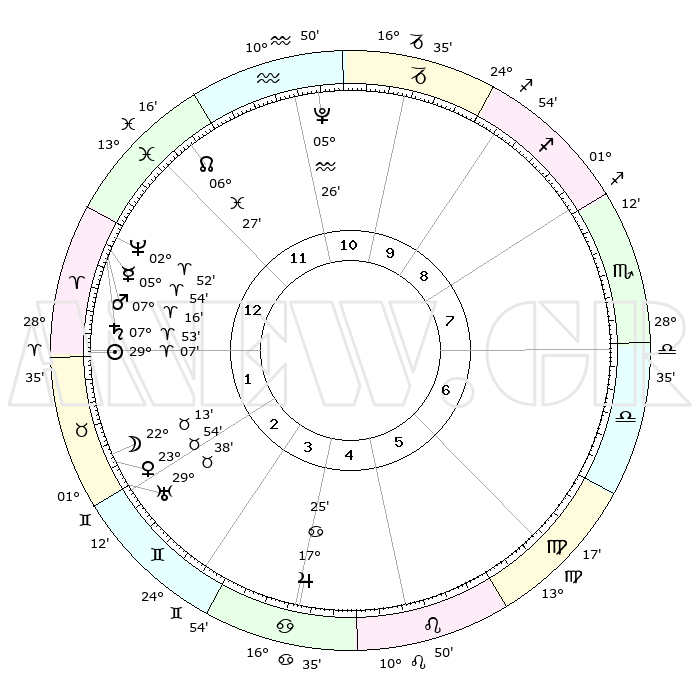 | | ΘΕΣΕΙΣ ΠΛΑΝΗΤΩΝ ΑΣΤΡΟΛΟΓΙΚΟΥ ΧΑΡΤΗ ΤΗΣ ΣΤΙΓΜΗΣ ΑΥΤΗΣ | | | | Πλανήτης | Ζώδιο | Μοίρες | Δεκαήμ. | Σε οίκο | Απόκλιση | | Ακμές των οίκων | | Ηλιος | Κριός | 29°03' | Τρίτο | 2 | 11 N 08 | | 1ος | 15°14' | Ιχθείς | | Σελήνη | Ταύρος | 21°06' | Τρίτο | 2 | 22 N 44 | | 2ος | 28°40' | Κριός | | Ερμής | Κριός | 05°47' | Πρώτο | 1 | 00 S 07 | | 3ος | 28°31' | Ταύρος | | Αφροδίτη | Ταύρος | 23°49' | Τρίτο | 2 | 19 N 04 | | 4ος | 21°39' | Δίδυμοι | | Αρης | Κριός | 07°12' | Πρώτο | 1 | 01 N 59 | | 5ος | 13°28' | Καρκίνος | | Δίας | Καρκίνος | 17°24' | Δεύτερο | 5 | 22 N 41 | | 6ος | 08°47' | Λέων | | Κρόνος | Κριός | 07°53' | Πρώτο | 1 | 01 N 09 | | 7ος | 15°14' | Παρθένος | | Ουρανός | Ταύρος | 29°38' | Τρίτο | 3 | 19 N 54 | | 8ος | 28°40' | Ζυγός | | Ποσειδώνας | Κριός | 02°52' | Πρώτο | 1 | 00 S 04 | | 9ος | 28°31' | Σκορπιός | | Πλούτωνας | Υδροχόος | 05°26' | Πρώτο | 11 | 22 S 47 | | 10ος | 21°39' | Τοξότης | | Β. Δεσμός | Ιχθείς | 06°27' | Πρώτο | 12 | 09 S 09 | | 11ος | 13°28' | Αιγόκερως | | Ωροσκόπος | Ιχθείς | 15°14' | Δεύτερο | | | 12ος | 08°47' | Υδροχόος | | Μεσουράνημα | Τοξότης | 21°39' | Τρίτο | | | |