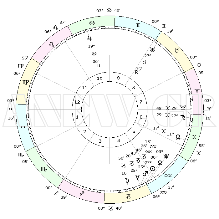 | | ΘΕΣΕΙΣ ΠΛΑΝΗΤΩΝ ΑΣΤΡΟΛΟΓΙΚΟΥ ΧΑΡΤΗ ΤΗΣ ΣΤΙΓΜΗΣ ΑΥΤΗΣ | | | | Πλανήτης | Ζώδιο | Μοίρες | Δεκαήμ. | Σε οίκο | Απόκλιση | | Ακμές των οίκων | | Ηλιος | Αιγόκερως | 27°42' | Τρίτο | 5 | 20 S 37 | | 1ος | 14°39' | Παρθένος | | Σελήνη | Αιγόκερως | 16°03' | Δεύτερο | 5 | 26 S 35 | | 2ος | 09°58' | Ζυγός | | Ερμής | Αιγόκερως | 25°13' | Τρίτο | 5 | 22 S 59 | | 3ος | 09°42' | Σκορπιός | | Αφροδίτη | Υδροχόος | 00°22' | Πρώτο | 5 | 21 S 06 | | 4ος | 12°39' | Τοξότης | | Αρης | Αιγόκερως | 25°40' | Τρίτο | 5 | 21 S 58 | | 5ος | 16°01' | Αιγόκερως | | Δίας | Καρκίνος | 19°06'R | Δεύτερο | 11 | 22 N 21 | | 6ος | 17°04' | Υδροχόος | | Κρόνος | Ιχθείς | 27°28' | Τρίτο | 7 | 03 S 02 | | 7ος | 14°39' | Ιχθείς | | Ουρανός | Ταύρος | 27°35'R | Τρίτο | 9 | 19 N 26 | | 8ος | 09°58' | Κριός | | Ποσειδώνας | Ιχθείς | 29°48' | Τρίτο | 7 | 01 S 18 | | 9ος | 09°42' | Ταύρος | | Πλούτωνας | Υδροχόος | 03°15' | Πρώτο | 5 | 23 S 07 | | 10ος | 12°39' | Δίδυμοι | | Β. Δεσμός | Ιχθείς | 11°17' | Δεύτερο | 6 | 07 S 20 | | 11ος | 16°01' | Καρκίνος | | Ωροσκόπος | Παρθένος | 14°39' | Δεύτερο | | | 12ος | 17°04' | Λέων | | Μεσουράνημα | Δίδυμοι | 12°39' | Δεύτερο | | | |