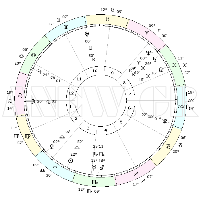 | ΘΕΣΕΙΣ ΠΛΑΝΗΤΩΝ ΑΣΤΡΟΛΟΓΙΚΟΥ ΧΑΡΤΗ ΤΗΣ ΣΤΙΓΜΗΣ ΑΥΤΗΣ | | Πλανήτης | Ζώδιο | Μοίρες | Δεκαήμ. | Σε οίκο | Απόκλιση | | Ακμές των οίκων | Ηλιος | Ζυγός | 22°45' | Τρίτο | 4 | 08 S 51 | | 1ος | 16°15' | Καρκίνος | Σελήνη | Λέων | 18°36' | Δεύτερο | 2 | 17 N 41 | | 2ος | 06°42' | Λέων | Ερμής | Σκορπιός | 13°16' | Δεύτερο | 5 | 17 S 33 | | 3ος | 29°60' | Λέων | Αφροδίτη | Ζυγός | 02°28' | Πρώτο | 4 | 00 N 25 | | 4ος | 29°01' | Παρθένος | Αρης | Σκορπιός | 16°06' | Δεύτερο | 5 | 16 S 53 | | 5ος | 04°49' | Σκορπιός | Δίας | Καρκίνος | 24°00' | Τρίτο | 1 | 21 N 21 | | 6ος | 12°49' | Τοξότης | Κρόνος | Ιχθείς | 26°50'R | Τρίτο | 9 | 03 S 33 | | 7ος | 16°15' | Αιγόκερως | Ουρανός | Δίδυμοι | 00°50'R | Πρώτο | 11 | 20 N 07 | | 8ος | 06°42' | Υδροχόος | Ποσειδώνας | Κριός | 00°09'R | Πρώτο | 10 | 01 S 12 | | 9ος | 29°60' | Υδροχόος | Πλούτωνας | Υδροχόος | 01°22' | Πρώτο | 7 | 23 S 32 | | 10ος | 29°01' | Ιχθείς | Β. Δεσμός | Ιχθείς | 16°15' | Δεύτερο | 9 | 05 S 25 | | 11ος | 04°49' | Ταύρος | Ωροσκόπος | Καρκίνος | 16°15' | Δεύτερο | | | 12ος | 12°49' | Δίδυμοι | Μεσουράνημα | Ιχθείς | 29°01' | Τρίτο | | | |