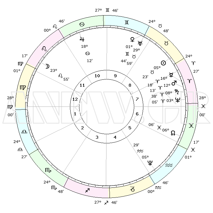 | | ΘΕΣΕΙΣ ΠΛΑΝΗΤΩΝ ΑΣΤΡΟΛΟΓΙΚΟΥ ΧΑΡΤΗ ΤΗΣ ΣΤΙΓΜΗΣ ΑΥΤΗΣ | | | | Πλανήτης | Ζώδιο | Μοίρες | Δεκαήμ. | Σε οίκο | Απόκλιση | | Ακμές των οίκων | | Ηλιος | Ταύρος | 05°20' | Πρώτο | 9 | 13 N 18 | | 1ος | 10°50' | Παρθένος | | Σελήνη | Λέων | 23°08' | Τρίτο | 12 | 14 N 59 | | 2ος | 05°48' | Ζυγός | | Ερμής | Κριός | 16°12' | Δεύτερο | 8 | 04 N 09 | | 3ος | 05°18' | Σκορπιός | | Αφροδίτη | Δίδυμοι | 01°39' | Πρώτο | 9 | 21 N 08 | | 4ος | 08°15' | Τοξότης | | Αρης | Κριός | 12°11' | Δεύτερο | 8 | 03 N 58 | | 5ος | 11°48' | Αιγόκερως | | Δίας | Καρκίνος | 18°11' | Δεύτερο | 11 | 22 N 35 | | 6ος | 13°03' | Υδροχόος | | Κρόνος | Κριός | 08°38' | Πρώτο | 8 | 01 N 26 | | 7ος | 10°50' | Ιχθείς | | Ουρανός | Ταύρος | 29°59' | Τρίτο | 9 | 19 N 59 | | 8ος | 05°48' | Κριός | | Ποσειδώνας | Κριός | 03°05' | Πρώτο | 7 | 00 N 01 | | 9ος | 05°18' | Ταύρος | | Πλούτωνας | Υδροχόος | 05°29' | Πρώτο | 5 | 22 S 48 | | 10ος | 08°15' | Δίδυμοι | | Β. Δεσμός | Ιχθείς | 06°06' | Πρώτο | 6 | 09 S 16 | | 11ος | 11°48' | Καρκίνος | | Ωροσκόπος | Παρθένος | 10°50' | Δεύτερο | | | 12ος | 13°03' | Λέων | | Μεσουράνημα | Δίδυμοι | 08°15' | Πρώτο | | | |