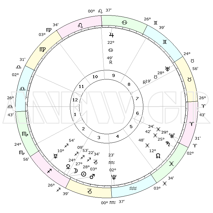 | | ΘΕΣΕΙΣ ΠΛΑΝΗΤΩΝ ΑΣΤΡΟΛΟΓΙΚΟΥ ΧΑΡΤΗ ΤΗΣ ΣΤΙΓΜΗΣ ΑΥΤΗΣ | | | | Πλανήτης | Ζώδιο | Μοίρες | Δεκαήμ. | Σε οίκο | Απόκλιση | | Ακμές των οίκων | | Ηλιος | Τοξότης | 28°18' | Τρίτο | 3 | 23 S 25 | | 1ος | 05°19' | Ζυγός | | Σελήνη | Τοξότης | 27°00' | Τρίτο | 3 | 28 S 14 | | 2ος | 02°16' | Σκορπιός | | Ερμής | Τοξότης | 10°48' | Δεύτερο | 3 | 21 S 10 | | 3ος | 02°54' | Τοξότης | | Αφροδίτη | Τοξότης | 24°04' | Τρίτο | 3 | 23 S 20 | | 4ος | 05°58' | Αιγόκερως | | Αρης | Αιγόκερως | 03°31' | Πρώτο | 3 | 24 S 12 | | 5ος | 08°54' | Υδροχόος | | Δίας | Καρκίνος | 22°50'R | Τρίτο | 10 | 21 N 42 | | 6ος | 09°08' | Ιχθείς | | Κρόνος | Ιχθείς | 25°42' | Τρίτο | 6 | 03 S 49 | | 7ος | 05°19' | Κριός | | Ουρανός | Ταύρος | 28°19'R | Τρίτο | 8 | 19 N 35 | | 8ος | 02°16' | Ταύρος | | Ποσειδώνας | Ιχθείς | 29°24' | Τρίτο | 6 | 01 S 28 | | 9ος | 02°54' | Δίδυμοι | | Πλούτωνας | Υδροχόος | 02°22' | Πρώτο | 4 | 23 S 18 | | 10ος | 05°58' | Καρκίνος | | Β. Δεσμός | Ιχθείς | 12°48' | Δεύτερο | 6 | 06 S 45 | | 11ος | 08°54' | Λέων | | Ωροσκόπος | Ζυγός | 05°19' | Πρώτο | | | 12ος | 09°08' | Παρθένος | | Μεσουράνημα | Καρκίνος | 05°58' | Πρώτο | | | |