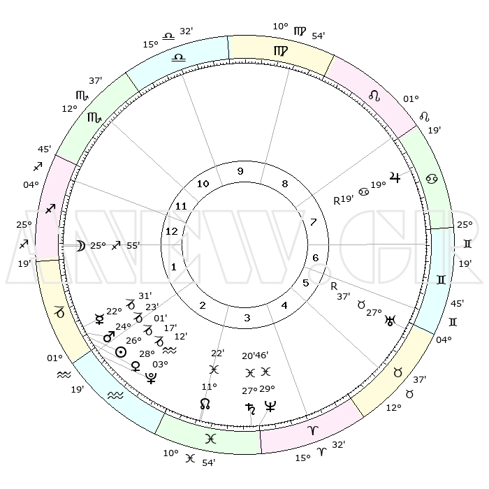 | | ΘΕΣΕΙΣ ΠΛΑΝΗΤΩΝ ΑΣΤΡΟΛΟΓΙΚΟΥ ΧΑΡΤΗ ΤΗΣ ΣΤΙΓΜΗΣ ΑΥΤΗΣ | | | | Πλανήτης | Ζώδιο | Μοίρες | Δεκαήμ. | Σε οίκο | Απόκλιση | | Ακμές των οίκων | | Ηλιος | Αιγόκερως | 25°57' | Τρίτο | 2 | 20 S 57 | | 1ος | 04°30' | Τοξότης | | Σελήνη | Τοξότης | 25°05' | Τρίτο | 1 | 28 S 17 | | 2ος | 06°17' | Αιγόκερως | | Ερμής | Αιγόκερως | 22°24' | Τρίτο | 2 | 23 S 23 | | 3ος | 12°45' | Υδροχόος | | Αφροδίτη | Αιγόκερως | 28°12' | Τρίτο | 2 | 21 S 30 | | 4ος | 18°50' | Ιχθείς | | Αρης | Αιγόκερως | 24°20' | Τρίτο | 2 | 22 S 12 | | 5ος | 19°17' | Κριός | | Δίας | Καρκίνος | 19°20'R | Δεύτερο | 8 | 22 N 19 | | 6ος | 13°43' | Ταύρος | | Κρόνος | Ιχθείς | 27°20' | Τρίτο | 4 | 03 S 06 | | 7ος | 04°30' | Δίδυμοι | | Ουρανός | Ταύρος | 27°37'R | Τρίτο | 6 | 19 N 26 | | 8ος | 06°17' | Καρκίνος | | Ποσειδώνας | Ιχθείς | 29°45' | Τρίτο | 4 | 01 S 19 | | 9ος | 12°45' | Λέων | | Πλούτωνας | Υδροχόος | 03°12' | Πρώτο | 2 | 23 S 07 | | 10ος | 18°50' | Παρθένος | | Β. Δεσμός | Ιχθείς | 11°22' | Δεύτερο | 3 | 07 S 18 | | 11ος | 19°17' | Ζυγός | | Ωροσκόπος | Τοξότης | 04°30' | Πρώτο | | | 12ος | 13°43' | Σκορπιός | | Μεσουράνημα | Παρθένος | 18°50' | Δεύτερο | | | |