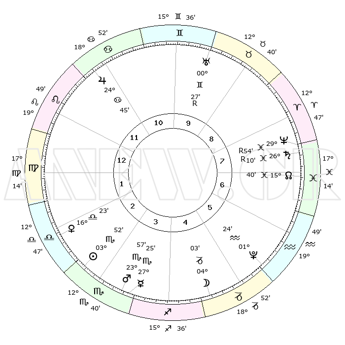 | | ΘΕΣΕΙΣ ΠΛΑΝΗΤΩΝ ΑΣΤΡΟΛΟΓΙΚΟΥ ΧΑΡΤΗ ΤΗΣ ΣΤΙΓΜΗΣ ΑΥΤΗΣ | | | | Πλανήτης | Ζώδιο | Μοίρες | Δεκαήμ. | Σε οίκο | Απόκλιση | | Ακμές των οίκων | | Ηλιος | Σκορπιός | 03°47' | Πρώτο | 3 | 12 S 46 | | 1ος | 20°17' | Λέων | | Σελήνη | Αιγόκερως | 02°57' | Πρώτο | 5 | 28 S 20 | | 2ος | 13°07' | Παρθένος | | Ερμής | Σκορπιός | 27°19' | Τρίτο | 4 | 22 S 13 | | 3ος | 10°48' | Ζυγός | | Αφροδίτη | Ζυγός | 16°16' | Δεύτερο | 3 | 05 S 00 | | 4ος | 13°28' | Σκορπιός | | Αρης | Σκορπιός | 23°53' | Τρίτο | 4 | 19 S 04 | | 5ος | 18°22' | Τοξότης | | Δίας | Καρκίνος | 24°45' | Τρίτο | 12 | 21 N 15 | | 6ος | 21°14' | Αιγόκερως | | Κρόνος | Ιχθείς | 26°10'R | Τρίτο | 8 | 03 S 48 | | 7ος | 20°17' | Υδροχόος | | Ουρανός | Δίδυμοι | 00°28'R | Πρώτο | 10 | 20 N 02 | | 8ος | 13°07' | Ιχθείς | | Ποσειδώνας | Ιχθείς | 29°54'R | Τρίτο | 8 | 01 S 18 | | 9ος | 10°48' | Κριός | | Πλούτωνας | Υδροχόος | 01°24' | Πρώτο | 6 | 23 S 31 | | 10ος | 13°28' | Ταύρος | | Β. Δεσμός | Ιχθείς | 15°40' | Δεύτερο | 8 | 05 S 39 | | 11ος | 18°22' | Δίδυμοι | | Ωροσκόπος | Λέων | 20°17' | Τρίτο | | | 12ος | 21°14' | Καρκίνος | | Μεσουράνημα | Ταύρος | 13°28' | Δεύτερο | | | |