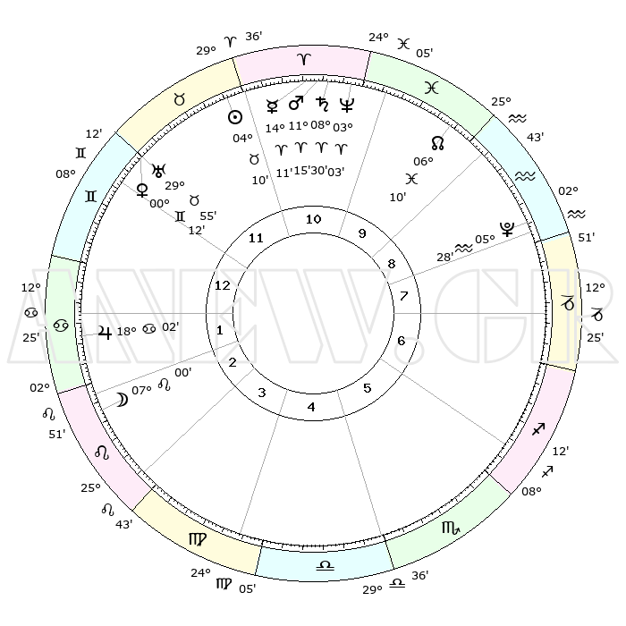 | | ΘΕΣΕΙΣ ΠΛΑΝΗΤΩΝ ΑΣΤΡΟΛΟΓΙΚΟΥ ΧΑΡΤΗ ΤΗΣ ΣΤΙΓΜΗΣ ΑΥΤΗΣ | | | | Πλανήτης | Ζώδιο | Μοίρες | Δεκαήμ. | Σε οίκο | Απόκλιση | | Ακμές των οίκων | | Ηλιος | Ταύρος | 04°06' | Πρώτο | 11 | 12 N 53 | | 1ος | 22°28' | Δίδυμοι | | Σελήνη | Λέων | 06°10' | Πρώτο | 3 | 21 N 17 | | 2ος | 13°51' | Καρκίνος | | Ερμής | Κριός | 14°05' | Δεύτερο | 11 | 03 N 16 | | 3ος | 05°16' | Λέων | | Αφροδίτη | Δίδυμοι | 00°08' | Πρώτο | 12 | 20 N 45 | | 4ος | 00°27' | Παρθένος | | Αρης | Κριός | 11°13' | Δεύτερο | 11 | 03 N 35 | | 5ος | 03°05' | Ζυγός | | Δίας | Καρκίνος | 18°02' | Δεύτερο | 2 | 22 N 36 | | 6ος | 13°23' | Σκορπιός | | Κρόνος | Κριός | 08°29' | Πρώτο | 11 | 01 N 23 | | 7ος | 22°28' | Τοξότης | | Ουρανός | Ταύρος | 29°54' | Τρίτο | 12 | 19 N 58 | | 8ος | 13°51' | Αιγόκερως | | Ποσειδώνας | Κριός | 03°03' | Πρώτο | 10 | 00 N 00 | | 9ος | 05°16' | Υδροχόος | | Πλούτωνας | Υδροχόος | 05°28' | Πρώτο | 9 | 22 S 48 | | 10ος | 00°27' | Ιχθείς | | Β. Δεσμός | Ιχθείς | 06°10' | Πρώτο | 10 | 09 S 15 | | 11ος | 03°05' | Κριός | | Ωροσκόπος | Δίδυμοι | 22°28' | Τρίτο | | | 12ος | 13°23' | Ταύρος | | Μεσουράνημα | Ιχθείς | 00°27' | Πρώτο | | | |