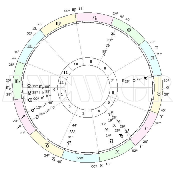 | | ΘΕΣΕΙΣ ΠΛΑΝΗΤΩΝ ΑΣΤΡΟΛΟΓΙΚΟΥ ΧΑΡΤΗ ΤΗΣ ΣΤΙΓΜΗΣ ΑΥΤΗΣ | | | | Πλανήτης | Ζώδιο | Μοίρες | Δεκαήμ. | Σε οίκο | Απόκλιση | | Ακμές των οίκων | | Ηλιος | Τοξότης | 00°04' | Πρώτο | 1 | 20 S 10 | | 1ος | 06°59' | Σκορπιός | | Σελήνη | Τοξότης | 20°16' | Τρίτο | 2 | 28 S 03 | | 2ος | 05°51' | Τοξότης | | Ερμής | Σκορπιός | 25°58'R | Τρίτο | 1 | 18 S 10 | | 3ος | 08°26' | Αιγόκερως | | Αφροδίτη | Σκορπιός | 19°04' | Δεύτερο | 1 | 16 S 31 | | 4ος | 13°07' | Υδροχόος | | Αρης | Τοξότης | 12°46' | Δεύτερο | 2 | 22 S 54 | | 5ος | 15°54' | Ιχθείς | | Δίας | Καρκίνος | 24°58'R | Τρίτο | 9 | 21 N 16 | | 6ος | 13°52' | Κριός | | Κρόνος | Ιχθείς | 25°19'R | Τρίτο | 5 | 04 S 04 | | 7ος | 06°59' | Ταύρος | | Ουρανός | Ταύρος | 29°25'R | Τρίτο | 7 | 19 N 49 | | 8ος | 05°51' | Δίδυμοι | | Ποσειδώνας | Ιχθείς | 29°28'R | Τρίτο | 5 | 01 S 27 | | 9ος | 08°26' | Καρκίνος | | Πλούτωνας | Υδροχόος | 01°44' | Πρώτο | 3 | 23 S 26 | | 10ος | 13°07' | Λέων | | Β. Δεσμός | Ιχθείς | 14°17' | Δεύτερο | 4 | 06 S 11 | | 11ος | 15°54' | Παρθένος | | Ωροσκόπος | Σκορπιός | 06°59' | Πρώτο | | | 12ος | 13°52' | Ζυγός | | Μεσουράνημα | Λέων | 13°07' | Δεύτερο | | | |
