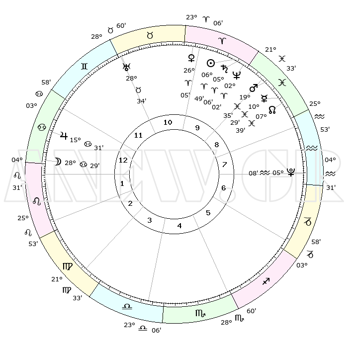 | | ΘΕΣΕΙΣ ΠΛΑΝΗΤΩΝ ΑΣΤΡΟΛΟΓΙΚΟΥ ΧΑΡΤΗ ΤΗΣ ΣΤΙΓΜΗΣ ΑΥΤΗΣ | | | | Πλανήτης | Ζώδιο | Μοίρες | Δεκαήμ. | Σε οίκο | Απόκλιση | | Ακμές των οίκων | | Ηλιος | Κριός | 06°46' | Πρώτο | 10 | 02 N 41 | | 1ος | 17°55' | Καρκίνος | | Σελήνη | Καρκίνος | 27°42' | Τρίτο | 1 | 23 N 59 | | 2ος | 08°24' | Λέων | | Ερμής | Ιχθείς | 10°27' | Δεύτερο | 9 | 08 S 06 | | 3ος | 01°53' | Παρθένος | | Αφροδίτη | Κριός | 26°01' | Τρίτο | 10 | 09 N 28 | | 4ος | 01°10' | Ζυγός | | Αρης | Ιχθείς | 19°33' | Δεύτερο | 9 | 05 S 07 | | 5ος | 07°04' | Σκορπιός | | Δίας | Καρκίνος | 15°31' | Δεύτερο | 12 | 22 N 54 | | 6ος | 14°48' | Τοξότης | | Κρόνος | Κριός | 05°05' | Πρώτο | 10 | 00 N 04 | | 7ος | 17°55' | Αιγόκερως | | Ουρανός | Ταύρος | 28°34' | Τρίτο | 11 | 19 N 40 | | 8ος | 08°24' | Υδροχόος | | Ποσειδώνας | Κριός | 02°02' | Πρώτο | 10 | 00 S 23 | | 9ος | 01°53' | Ιχθείς | | Πλούτωνας | Υδροχόος | 05°08' | Πρώτο | 7 | 22 S 48 | | 10ος | 01°10' | Κριός | | Β. Δεσμός | Ιχθείς | 07°39' | Πρώτο | 9 | 08 S 42 | | 11ος | 07°04' | Ταύρος | | Ωροσκόπος | Καρκίνος | 17°55' | Δεύτερο | | | 12ος | 14°48' | Δίδυμοι | | Μεσουράνημα | Κριός | 01°10' | Πρώτο | | | |