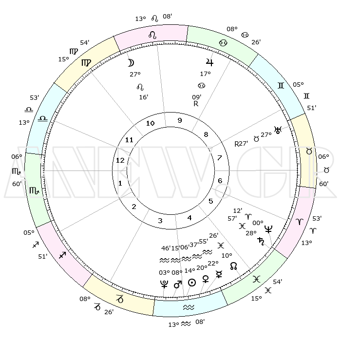 | | ΘΕΣΕΙΣ ΠΛΑΝΗΤΩΝ ΑΣΤΡΟΛΟΓΙΚΟΥ ΧΑΡΤΗ ΤΗΣ ΣΤΙΓΜΗΣ ΑΥΤΗΣ | | | | Πλανήτης | Ζώδιο | Μοίρες | Δεκαήμ. | Σε οίκο | Απόκλιση | | Ακμές των οίκων | | Ηλιος | Υδροχόος | 14°02' | Δεύτερο | 4 | 16 S 37 | | 1ος | 19°48' | Ζυγός | | Σελήνη | Λέων | 26°27' | Τρίτο | 11 | 13 N 46 | | 2ος | 17°37' | Σκορπιός | | Ερμής | Υδροχόος | 22°49' | Τρίτο | 4 | 15 S 34 | | 3ος | 18°54' | Τοξότης | | Αφροδίτη | Υδροχόος | 20°33' | Τρίτο | 4 | 15 S 57 | | 4ος | 22°29' | Αιγόκερως | | Αρης | Υδροχόος | 08°13' | Πρώτο | 4 | 19 S 13 | | 5ος | 25°26' | Υδροχόος | | Δίας | Καρκίνος | 17°09'R | Δεύτερο | 9 | 22 N 38 | | 6ος | 24°54' | Ιχθείς | | Κρόνος | Ιχθείς | 28°57' | Τρίτο | 6 | 02 S 25 | | 7ος | 19°48' | Κριός | | Ουρανός | Ταύρος | 27°27'R | Τρίτο | 8 | 19 N 24 | | 8ος | 17°37' | Ταύρος | | Ποσειδώνας | Κριός | 00°12' | Πρώτο | 6 | 01 S 08 | | 9ος | 18°54' | Δίδυμοι | | Πλούτωνας | Υδροχόος | 03°46' | Πρώτο | 4 | 23 S 01 | | 10ος | 22°29' | Καρκίνος | | Β. Δεσμός | Ιχθείς | 10°26' | Δεύτερο | 5 | 07 S 39 | | 11ος | 25°26' | Λέων | | Ωροσκόπος | Ζυγός | 19°48' | Δεύτερο | | | 12ος | 24°54' | Παρθένος | | Μεσουράνημα | Καρκίνος | 22°29' | Τρίτο | | | |