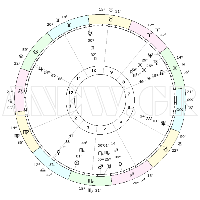 | | ΘΕΣΕΙΣ ΠΛΑΝΗΤΩΝ ΑΣΤΡΟΛΟΓΙΚΟΥ ΧΑΡΤΗ ΤΗΣ ΣΤΙΓΜΗΣ ΑΥΤΗΣ | | | | Πλανήτης | Ζώδιο | Μοίρες | Δεκαήμ. | Σε οίκο | Απόκλιση | | Ακμές των οίκων | | Ηλιος | Σκορπιός | 01°43' | Πρώτο | 4 | 12 S 04 | | 1ος | 28°32' | Καρκίνος | | Σελήνη | Τοξότης | 08°17' | Πρώτο | 5 | 26 S 41 | | 2ος | 19°29' | Λέων | | Ερμής | Σκορπιός | 24°56' | Τρίτο | 5 | 21 S 32 | | 3ος | 14°20' | Παρθένος | | Αφροδίτη | Ζυγός | 13°41' | Δεύτερο | 3 | 03 S 59 | | 4ος | 15°11' | Ζυγός | | Αρης | Σκορπιός | 22°26' | Τρίτο | 5 | 18 S 41 | | 5ος | 21°15' | Σκορπιός | | Δίας | Καρκίνος | 24°38' | Τρίτο | 12 | 21 N 16 | | 6ος | 27°12' | Τοξότης | | Κρόνος | Ιχθείς | 26°17'R | Τρίτο | 9 | 03 S 45 | | 7ος | 28°32' | Αιγόκερως | | Ουρανός | Δίδυμοι | 00°32'R | Πρώτο | 11 | 20 N 03 | | 8ος | 19°29' | Υδροχόος | | Ποσειδώνας | Ιχθείς | 29°56'R | Τρίτο | 9 | 01 S 17 | | 9ος | 14°20' | Ιχθείς | | Πλούτωνας | Υδροχόος | 01°24' | Πρώτο | 7 | 23 S 32 | | 10ος | 15°11' | Κριός | | Β. Δεσμός | Ιχθείς | 15°47' | Δεύτερο | 9 | 05 S 36 | | 11ος | 21°15' | Ταύρος | | Ωροσκόπος | Καρκίνος | 28°32' | Τρίτο | | | 12ος | 27°12' | Δίδυμοι | | Μεσουράνημα | Κριός | 15°11' | Δεύτερο | | | |