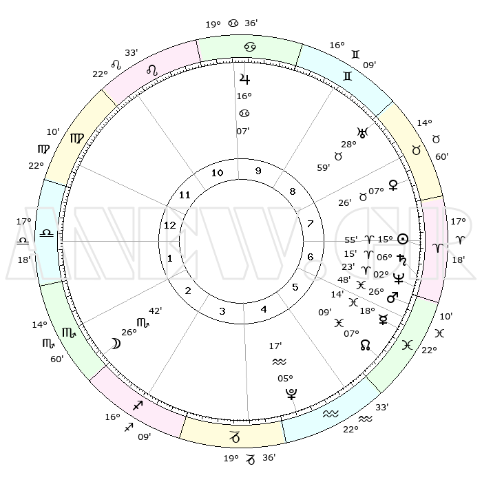 | | ΘΕΣΕΙΣ ΠΛΑΝΗΤΩΝ ΑΣΤΡΟΛΟΓΙΚΟΥ ΧΑΡΤΗ ΤΗΣ ΣΤΙΓΜΗΣ ΑΥΤΗΣ | | | | Πλανήτης | Ζώδιο | Μοίρες | Δεκαήμ. | Σε οίκο | Απόκλιση | | Ακμές των οίκων | | Ηλιος | Κριός | 15°48' | Δεύτερο | 8 | 06 N 13 | | 1ος | 10°06' | Παρθένος | | Σελήνη | Σκορπιός | 25°11' | Τρίτο | 3 | 23 S 56 | | 2ος | 04°59' | Ζυγός | | Ερμής | Ιχθείς | 18°06' | Δεύτερο | 7 | 06 S 28 | | 3ος | 04°27' | Σκορπιός | | Αφροδίτη | Ταύρος | 07°17' | Πρώτο | 9 | 13 N 42 | | 4ος | 07°24' | Τοξότης | | Αρης | Ιχθείς | 26°42' | Τρίτο | 7 | 02 S 15 | | 5ος | 10°59' | Αιγόκερως | | Δίας | Καρκίνος | 16°07' | Δεύτερο | 11 | 22 N 50 | | 6ος | 12°16' | Υδροχόος | | Κρόνος | Κριός | 06°14' | Πρώτο | 8 | 00 N 31 | | 7ος | 10°06' | Ιχθείς | | Ουρανός | Ταύρος | 28°58' | Τρίτο | 9 | 19 N 45 | | 8ος | 04°59' | Κριός | | Ποσειδώνας | Κριός | 02°23' | Πρώτο | 7 | 00 S 15 | | 9ος | 04°27' | Ταύρος | | Πλούτωνας | Υδροχόος | 05°17' | Πρώτο | 5 | 22 S 47 | | 10ος | 07°24' | Δίδυμοι | | Β. Δεσμός | Ιχθείς | 07°10' | Πρώτο | 6 | 08 S 53 | | 11ος | 10°59' | Καρκίνος | | Ωροσκόπος | Παρθένος | 10°06' | Δεύτερο | | | 12ος | 12°16' | Λέων | | Μεσουράνημα | Δίδυμοι | 07°24' | Πρώτο | | | |