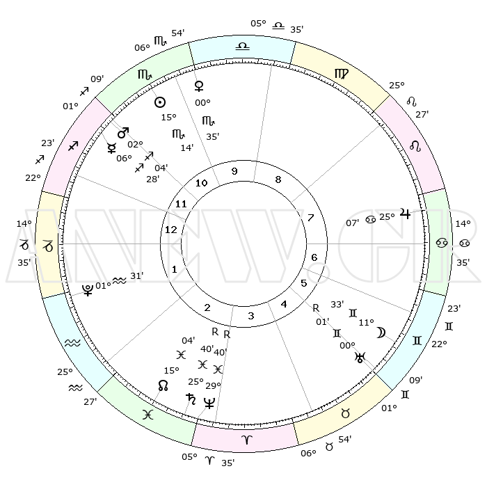 | | ΘΕΣΕΙΣ ΠΛΑΝΗΤΩΝ ΑΣΤΡΟΛΟΓΙΚΟΥ ΧΑΡΤΗ ΤΗΣ ΣΤΙΓΜΗΣ ΑΥΤΗΣ | | | | Πλανήτης | Ζώδιο | Μοίρες | Δεκαήμ. | Σε οίκο | Απόκλιση | | Ακμές των οίκων | | Ηλιος | Σκορπιός | 15°08' | Δεύτερο | 11 | 16 S 22 | | 1ος | 11°41' | Τοξότης | | Σελήνη | Δίδυμοι | 10°02' | Δεύτερο | 6 | 26 N 56 | | 2ος | 14°44' | Αιγόκερως | | Ερμής | Τοξότης | 06°26' | Πρώτο | 12 | 24 S 00 | | 3ος | 22°24' | Υδροχόος | | Αφροδίτη | Σκορπιός | 00°27' | Πρώτο | 11 | 10 S 20 | | 4ος | 28°19' | Ιχθείς | | Αρης | Τοξότης | 01°59' | Πρώτο | 12 | 21 S 00 | | 5ος | 27°40' | Κριός | | Δίας | Καρκίνος | 25°07' | Τρίτο | 8 | 21 N 12 | | 6ος | 21°12' | Ταύρος | | Κρόνος | Ιχθείς | 25°40'R | Τρίτο | 3 | 03 S 58 | | 7ος | 11°41' | Δίδυμοι | | Ουρανός | Δίδυμοι | 00°02'R | Πρώτο | 6 | 19 N 57 | | 8ος | 14°44' | Καρκίνος | | Ποσειδώνας | Ιχθείς | 29°40'R | Τρίτο | 4 | 01 S 23 | | 9ος | 22°24' | Λέων | | Πλούτωνας | Υδροχόος | 01°30' | Πρώτο | 2 | 23 S 30 | | 10ος | 28°19' | Παρθένος | | Β. Δεσμός | Ιχθείς | 15°04' | Δεύτερο | 3 | 05 S 53 | | 11ος | 27°40' | Ζυγός | | Ωροσκόπος | Τοξότης | 11°41' | Δεύτερο | | | 12ος | 21°12' | Σκορπιός | | Μεσουράνημα | Παρθένος | 28°19' | Τρίτο | | | |