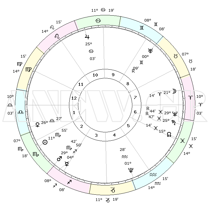 | | ΘΕΣΕΙΣ ΠΛΑΝΗΤΩΝ ΑΣΤΡΟΛΟΓΙΚΟΥ ΧΑΡΤΗ ΤΗΣ ΣΤΙΓΜΗΣ ΑΥΤΗΣ | | | | Πλανήτης | Ζώδιο | Μοίρες | Δεκαήμ. | Σε οίκο | Απόκλιση | | Ακμές των οίκων | | Ηλιος | Σκορπιός | 11°38' | Δεύτερο | 5 | 15 S 19 | | 1ος | 17°15' | Καρκίνος | | Σελήνη | Κριός | 17°01' | Δεύτερο | 10 | 09 N 03 | | 2ος | 07°43' | Λέων | | Ερμής | Τοξότης | 04°38' | Πρώτο | 5 | 23 S 53 | | 3ος | 01°07' | Παρθένος | | Αφροδίτη | Ζυγός | 26°06' | Τρίτο | 4 | 08 S 44 | | 4ος | 00°18' | Ζυγός | | Αρης | Σκορπιός | 29°29' | Τρίτο | 5 | 20 S 27 | | 5ος | 06°09' | Σκορπιός | | Δίας | Καρκίνος | 25°03' | Τρίτο | 1 | 21 N 12 | | 6ος | 14°00' | Τοξότης | | Κρόνος | Ιχθείς | 25°48'R | Τρίτο | 9 | 03 S 56 | | 7ος | 17°15' | Αιγόκερως | | Ουρανός | Δίδυμοι | 00°10'R | Πρώτο | 11 | 19 N 59 | | 8ος | 07°43' | Υδροχόος | | Ποσειδώνας | Ιχθείς | 29°44'R | Τρίτο | 9 | 01 S 22 | | 9ος | 01°07' | Ιχθείς | | Πλούτωνας | Υδροχόος | 01°28' | Πρώτο | 7 | 23 S 30 | | 10ος | 00°18' | Κριός | | Β. Δεσμός | Ιχθείς | 15°15' | Δεύτερο | 9 | 05 S 49 | | 11ος | 06°09' | Ταύρος | | Ωροσκόπος | Καρκίνος | 17°15' | Δεύτερο | | | 12ος | 14°00' | Δίδυμοι | | Μεσουράνημα | Κριός | 00°18' | Πρώτο | | | |
