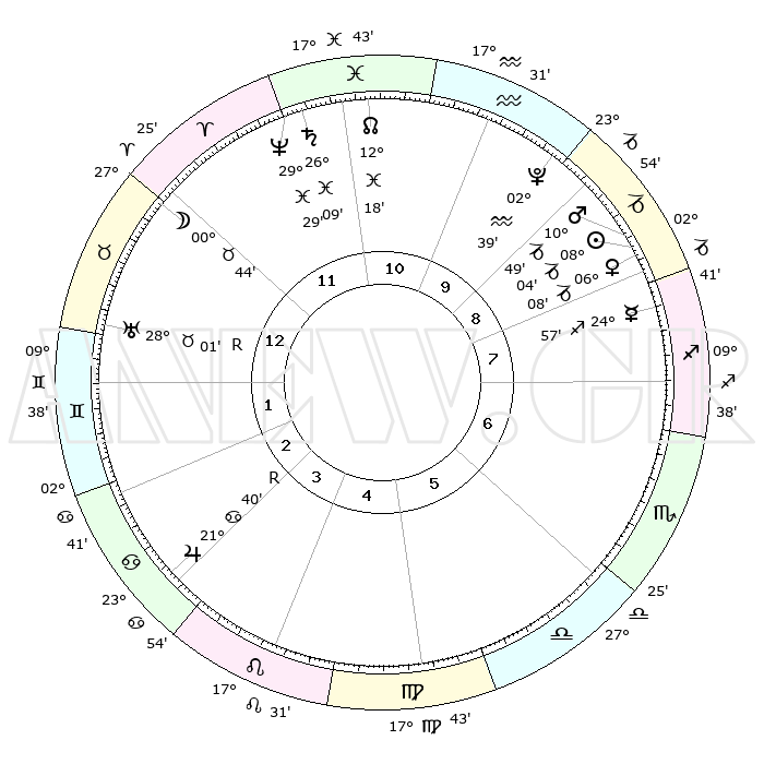 | | ΘΕΣΕΙΣ ΠΛΑΝΗΤΩΝ ΑΣΤΡΟΛΟΓΙΚΟΥ ΧΑΡΤΗ ΤΗΣ ΣΤΙΓΜΗΣ ΑΥΤΗΣ | | | | Πλανήτης | Ζώδιο | Μοίρες | Δεκαήμ. | Σε οίκο | Απόκλιση | | Ακμές των οίκων | | Ηλιος | Αιγόκερως | 08°00' | Πρώτο | 9 | 23 S 11 | | 1ος | 07°35' | Ταύρος | | Σελήνη | Κριός | 29°43' | Τρίτο | 12 | 14 N 56 | | 2ος | 07°45' | Δίδυμοι | | Ερμής | Τοξότης | 24°50' | Τρίτο | 8 | 23 S 37 | | 3ος | 00°35' | Καρκίνος | | Αφροδίτη | Αιγόκερως | 06°03' | Πρώτο | 9 | 23 S 42 | | 4ος | 22°21' | Καρκίνος | | Αρης | Αιγόκερως | 10°46' | Δεύτερο | 9 | 23 S 52 | | 5ος | 17°34' | Λέων | | Δίας | Καρκίνος | 21°41'R | Τρίτο | 3 | 21 N 55 | | 6ος | 21°48' | Παρθένος | | Κρόνος | Ιχθείς | 26°09' | Τρίτο | 12 | 03 S 37 | | 7ος | 07°35' | Σκορπιός | | Ουρανός | Ταύρος | 28°01'R | Τρίτο | 1 | 19 N 31 | | 8ος | 07°45' | Τοξότης | | Ποσειδώνας | Ιχθείς | 29°29' | Τρίτο | 12 | 01 S 26 | | 9ος | 00°35' | Αιγόκερως | | Πλούτωνας | Υδροχόος | 02°39' | Πρώτο | 10 | 23 S 14 | | 10ος | 22°21' | Αιγόκερως | | Β. Δεσμός | Ιχθείς | 12°18' | Δεύτερο | 11 | 06 S 57 | | 11ος | 17°34' | Υδροχόος | | Ωροσκόπος | Ταύρος | 07°35' | Πρώτο | | | 12ος | 21°48' | Ιχθείς | | Μεσουράνημα | Αιγόκερως | 22°21' | Τρίτο | | | |