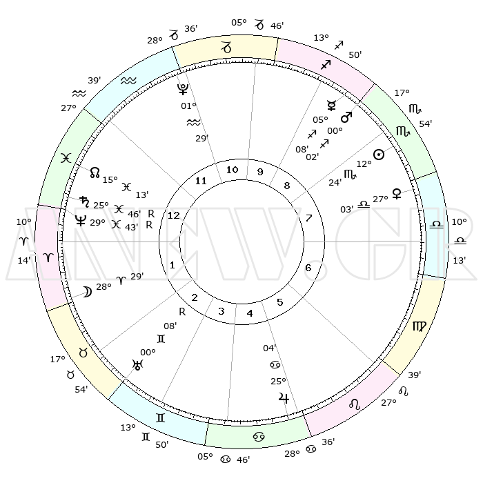 |  | ΘΕΣΕΙΣ ΠΛΑΝΗΤΩΝ ΑΣΤΡΟΛΟΓΙΚΟΥ ΧΑΡΤΗ ΤΗΣ ΣΤΙΓΜΗΣ ΑΥΤΗΣ |  |   |  | Πλανήτης | Ζώδιο | Μοίρες | Δεκαήμ. | Σε οίκο | Απόκλιση |   | Ακμές των οίκων |  | Ηλιος | Σκορπιός | 12°11' | Δεύτερο | 10 | 15 S 29 |   | 1ος | 27°34' | Τοξότης |  | Σελήνη | Κριός | 25°10' | Τρίτο | 4 | 12 N 40 |   | 2ος | 04°06' | Υδροχόος |  | Ερμής | Τοξότης | 04°60' | Πρώτο | 11 | 23 S 56 |   | 3ος | 13°55' | Ιχθείς |  | Αφροδίτη | Ζυγός | 26°47' | Τρίτο | 10 | 08 S 59 |   | 4ος | 18°13' | Κριός |  | Αρης | Σκορπιός | 29°53' | Τρίτο | 11 | 20 S 32 |   | 5ος | 14°56' | Ταύρος |  | Δίας | Καρκίνος | 25°04' | Τρίτο | 7 | 21 N 12 |   | 6ος | 06°54' | Δίδυμοι |  | Κρόνος | Ιχθείς | 25°47'R | Τρίτο | 3 | 03 S 56 |   | 7ος | 27°34' | Δίδυμοι |  | Ουρανός | Δίδυμοι | 00°09'R | Πρώτο | 5 | 19 N 58 |   | 8ος | 04°06' | Λέων |  | Ποσειδώνας | Ιχθείς | 29°43'R | Τρίτο | 3 | 01 S 22 |   | 9ος | 13°55' | Παρθένος |  | Πλούτωνας | Υδροχόος | 01°29' | Πρώτο | 1 | 23 S 30 |   | 10ος | 18°13' | Ζυγός |  | Β. Δεσμός | Ιχθείς | 15°13' | Δεύτερο | 3 | 05 S 49 |   | 11ος | 14°56' | Σκορπιός |  | Ωροσκόπος | Τοξότης | 27°34' | Τρίτο |   |   | 12ος | 06°54' | Τοξότης |  | Μεσουράνημα | Ζυγός | 18°13' | Δεύτερο |   |   |   |