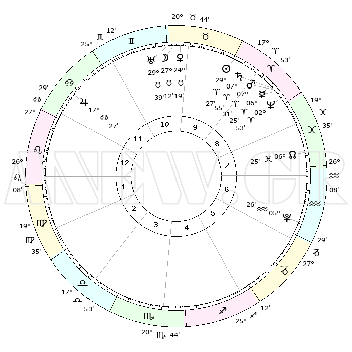 | | ΘΕΣΕΙΣ ΠΛΑΝΗΤΩΝ ΑΣΤΡΟΛΟΓΙΚΟΥ ΧΑΡΤΗ ΤΗΣ ΣΤΙΓΜΗΣ ΑΥΤΗΣ | | | | Πλανήτης | Ζώδιο | Μοίρες | Δεκαήμ. | Σε οίκο | Απόκλιση | | Ακμές των οίκων | | Ηλιος | Κριός | 29°23' | Τρίτο | 10 | 11 N 15 | | 1ος | 08°38' | Λέων | | Σελήνη | Ταύρος | 26°18' | Τρίτο | 10 | 24 N 11 | | 2ος | 00°21' | Παρθένος | | Ερμής | Κριός | 06°19' | Πρώτο | 9 | 00 N 06 | | 3ος | 26°34' | Παρθένος | | Αφροδίτη | Ταύρος | 24°14' | Τρίτο | 10 | 19 N 11 | | 4ος | 28°31' | Ζυγός | | Αρης | Κριός | 07°29' | Πρώτο | 9 | 02 N 05 | | 5ος | 04°12' | Τοξότης | | Δίας | Καρκίνος | 17°27' | Δεύτερο | 12 | 22 N 41 | | 6ος | 08°33' | Αιγόκερως | | Κρόνος | Κριός | 07°55' | Πρώτο | 9 | 01 N 10 | | 7ος | 08°38' | Υδροχόος | | Ουρανός | Ταύρος | 29°39' | Τρίτο | 10 | 19 N 54 | | 8ος | 00°21' | Ιχθείς | | Ποσειδώνας | Κριός | 02°53' | Πρώτο | 9 | 00 S 04 | | 9ος | 26°34' | Ιχθείς | | Πλούτωνας | Υδροχόος | 05°26' | Πρώτο | 6 | 22 S 48 | | 10ος | 28°31' | Κριός | | Β. Δεσμός | Ιχθείς | 06°26' | Πρώτο | 8 | 09 S 09 | | 11ος | 04°12' | Δίδυμοι | | Ωροσκόπος | Λέων | 08°38' | Πρώτο | | | 12ος | 08°33' | Καρκίνος | | Μεσουράνημα | Κριός | 28°31' | Τρίτο | | | |