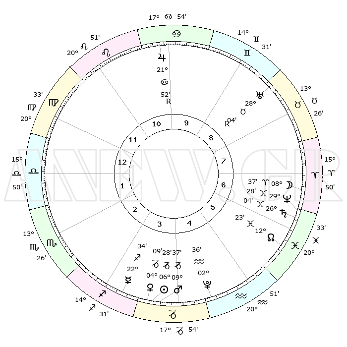| | ΘΕΣΕΙΣ ΠΛΑΝΗΤΩΝ ΑΣΤΡΟΛΟΓΙΚΟΥ ΧΑΡΤΗ ΤΗΣ ΣΤΙΓΜΗΣ ΑΥΤΗΣ | | | | Πλανήτης | Ζώδιο | Μοίρες | Δεκαήμ. | Σε οίκο | Απόκλιση | | Ακμές των οίκων | | Ηλιος | Αιγόκερως | 06°23' | Πρώτο | 4 | 23 S 17 | | 1ος | 23°44' | Παρθένος | | Σελήνη | Κριός | 07°35' | Πρώτο | 7 | 05 N 05 | | 2ος | 19°50' | Ζυγός | | Ερμής | Τοξότης | 22°27' | Τρίτο | 3 | 23 S 19 | | 3ος | 20°01' | Σκορπιός | | Αφροδίτη | Αιγόκερως | 04°03' | Πρώτο | 4 | 23 S 43 | | 4ος | 22°57' | Τοξότης | | Αρης | Αιγόκερως | 09°33' | Πρώτο | 4 | 23 S 57 | | 5ος | 26°02' | Αιγόκερως | | Δίας | Καρκίνος | 21°53'R | Τρίτο | 10 | 21 N 53 | | 6ος | 26°43' | Υδροχόος | | Κρόνος | Ιχθείς | 26°04' | Τρίτο | 7 | 03 S 39 | | 7ος | 23°44' | Ιχθείς | | Ουρανός | Ταύρος | 28°04'R | Τρίτο | 9 | 19 N 32 | | 8ος | 19°50' | Κριός | | Ποσειδώνας | Ιχθείς | 29°28' | Τρίτο | 7 | 01 S 26 | | 9ος | 20°01' | Ταύρος | | Πλούτωνας | Υδροχόος | 02°36' | Πρώτο | 5 | 23 S 15 | | 10ος | 22°57' | Δίδυμοι | | Β. Δεσμός | Ιχθείς | 12°23' | Δεύτερο | 6 | 06 S 55 | | 11ος | 26°02' | Καρκίνος | | Ωροσκόπος | Παρθένος | 23°44' | Τρίτο | | | 12ος | 26°43' | Λέων | | Μεσουράνημα | Δίδυμοι | 22°57' | Τρίτο | | | |