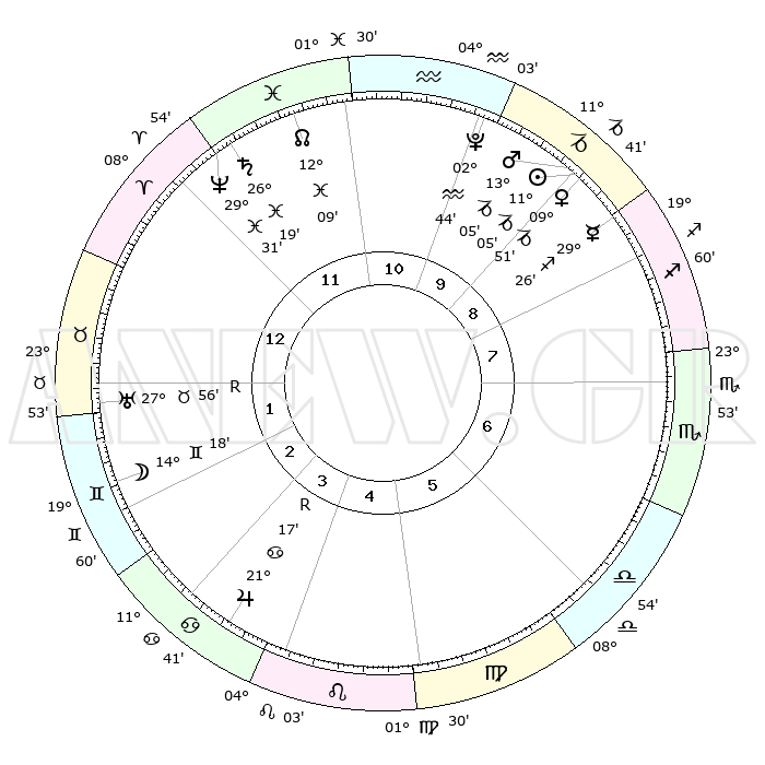 | | ΘΕΣΕΙΣ ΠΛΑΝΗΤΩΝ ΑΣΤΡΟΛΟΓΙΚΟΥ ΧΑΡΤΗ ΤΗΣ ΣΤΙΓΜΗΣ ΑΥΤΗΣ | | | | Πλανήτης | Ζώδιο | Μοίρες | Δεκαήμ. | Σε οίκο | Απόκλιση | | Ακμές των οίκων | | Ηλιος | Αιγόκερως | 11°01' | Δεύτερο | 9 | 22 S 59 | | 1ος | 20°38' | Κριός | | Σελήνη | Δίδυμοι | 13°19' | Δεύτερο | 2 | 27 N 25 | | 2ος | 25°28' | Ταύρος | | Ερμής | Τοξότης | 29°20' | Τρίτο | 9 | 24 S 03 | | 3ος | 20°03' | Δίδυμοι | | Αφροδίτη | Αιγόκερως | 09°46' | Πρώτο | 9 | 23 S 36 | | 4ος | 11°47' | Καρκίνος | | Αρης | Αιγόκερως | 13°02' | Δεύτερο | 10 | 23 S 41 | | 5ος | 05°21' | Λέων | | Δίας | Καρκίνος | 21°18'R | Τρίτο | 4 | 21 N 59 | | 6ος | 06°16' | Παρθένος | | Κρόνος | Ιχθείς | 26°19' | Τρίτο | 12 | 03 S 32 | | 7ος | 20°38' | Ζυγός | | Ουρανός | Ταύρος | 27°56'R | Τρίτο | 2 | 19 N 30 | | 8ος | 25°28' | Σκορπιός | | Ποσειδώνας | Ιχθείς | 29°31' | Τρίτο | 12 | 01 S 25 | | 9ος | 20°03' | Τοξότης | | Πλούτωνας | Υδροχόος | 02°44' | Πρώτο | 10 | 23 S 13 | | 10ος | 11°47' | Αιγόκερως | | Β. Δεσμός | Ιχθείς | 12°09' | Δεύτερο | 12 | 07 S 00 | | 11ος | 05°21' | Υδροχόος | | Ωροσκόπος | Κριός | 20°38' | Τρίτο | | | 12ος | 06°16' | Ιχθείς | | Μεσουράνημα | Αιγόκερως | 11°47' | Δεύτερο | | | |