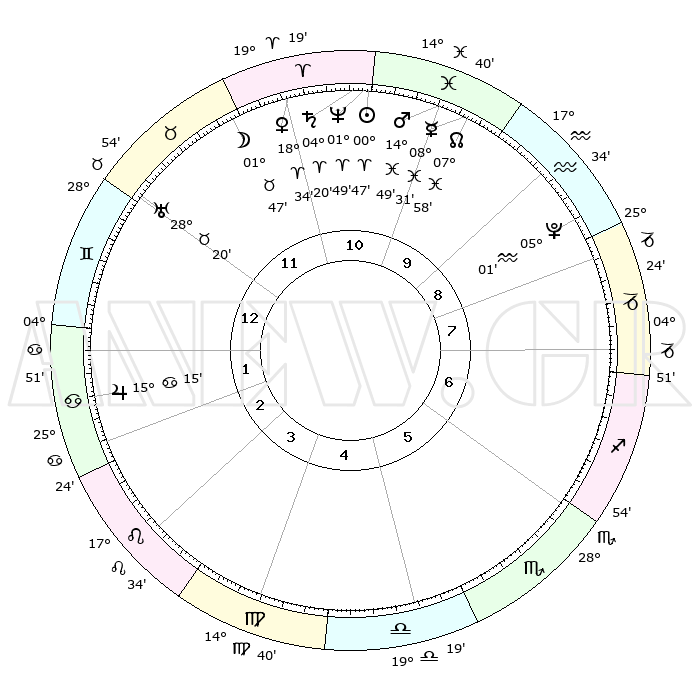 | | ΘΕΣΕΙΣ ΠΛΑΝΗΤΩΝ ΑΣΤΡΟΛΟΓΙΚΟΥ ΧΑΡΤΗ ΤΗΣ ΣΤΙΓΜΗΣ ΑΥΤΗΣ | | | | Πλανήτης | Ζώδιο | Μοίρες | Δεκαήμ. | Σε οίκο | Απόκλιση | | Ακμές των οίκων | | Ηλιος | Κριός | 00°43' | Πρώτο | 11 | 00 N 17 | | 1ος | 08°23' | Δίδυμοι | | Σελήνη | Ταύρος | 00°42' | Πρώτο | 12 | 15 N 35 | | 2ος | 01°39' | Καρκίνος | | Ερμής | Ιχθείς | 08°30' | Πρώτο | 10 | 07 S 35 | | 3ος | 22°52' | Καρκίνος | | Αφροδίτη | Κριός | 18°28' | Δεύτερο | 11 | 06 N 27 | | 4ος | 16°21' | Λέων | | Αρης | Ιχθείς | 14°45' | Δεύτερο | 10 | 07 S 00 | | 5ος | 16°20' | Παρθένος | | Δίας | Καρκίνος | 15°15' | Δεύτερο | 2 | 22 N 55 | | 6ος | 25°54' | Ζυγός | | Κρόνος | Κριός | 04°20' | Πρώτο | 11 | 00 S 14 | | 7ος | 08°23' | Τοξότης | | Ουρανός | Ταύρος | 28°20' | Τρίτο | 12 | 19 N 37 | | 8ος | 01°39' | Αιγόκερως | | Ποσειδώνας | Κριός | 01°48' | Πρώτο | 11 | 00 S 29 | | 9ος | 22°52' | Αιγόκερως | | Πλούτωνας | Υδροχόος | 05°01' | Πρώτο | 9 | 22 S 48 | | 10ος | 16°21' | Υδροχόος | | Β. Δεσμός | Ιχθείς | 07°58' | Πρώτο | 10 | 08 S 35 | | 11ος | 16°20' | Ιχθείς | | Ωροσκόπος | Δίδυμοι | 08°23' | Πρώτο | | | 12ος | 25°54' | Κριός | | Μεσουράνημα | Υδροχόος | 16°21' | Δεύτερο | | | |