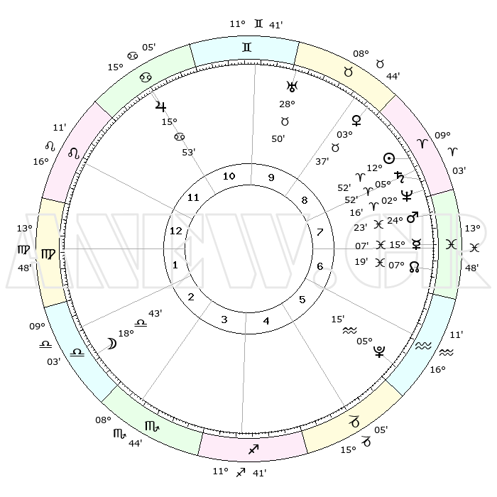 | | ΘΕΣΕΙΣ ΠΛΑΝΗΤΩΝ ΑΣΤΡΟΛΟΓΙΚΟΥ ΧΑΡΤΗ ΤΗΣ ΣΤΙΓΜΗΣ ΑΥΤΗΣ | | | | Πλανήτης | Ζώδιο | Μοίρες | Δεκαήμ. | Σε οίκο | Απόκλιση | | Ακμές των οίκων | | Ηλιος | Κριός | 12°47' | Δεύτερο | 8 | 05 N 03 | | 1ος | 22°08' | Λέων | | Σελήνη | Ζυγός | 17°48' | Δεύτερο | 3 | 10 S 00 | | 2ος | 15°10' | Παρθένος | | Ερμής | Ιχθείς | 15°03' | Δεύτερο | 7 | 07 S 18 | | 3ος | 13°03' | Ζυγός | | Αφροδίτη | Ταύρος | 03°32' | Πρώτο | 9 | 12 N 20 | | 4ος | 15°48' | Σκορπιός | | Αρης | Ιχθείς | 24°19' | Τρίτο | 8 | 03 S 13 | | 5ος | 20°33' | Τοξότης | | Δίας | Καρκίνος | 15°53' | Δεύτερο | 11 | 22 N 51 | | 6ος | 23°13' | Αιγόκερως | | Κρόνος | Κριός | 05°51' | Πρώτο | 8 | 00 N 22 | | 7ος | 22°08' | Υδροχόος | | Ουρανός | Ταύρος | 28°50' | Τρίτο | 10 | 19 N 44 | | 8ος | 15°10' | Ιχθείς | | Ποσειδώνας | Κριός | 02°16' | Πρώτο | 8 | 00 S 18 | | 9ος | 13°03' | Κριός | | Πλούτωνας | Υδροχόος | 05°14' | Πρώτο | 6 | 22 S 47 | | 10ος | 15°48' | Ταύρος | | Β. Δεσμός | Ιχθείς | 07°19' | Πρώτο | 7 | 08 S 49 | | 11ος | 20°33' | Δίδυμοι | | Ωροσκόπος | Λέων | 22°08' | Τρίτο | | | 12ος | 23°13' | Καρκίνος | | Μεσουράνημα | Ταύρος | 15°48' | Δεύτερο | | | |