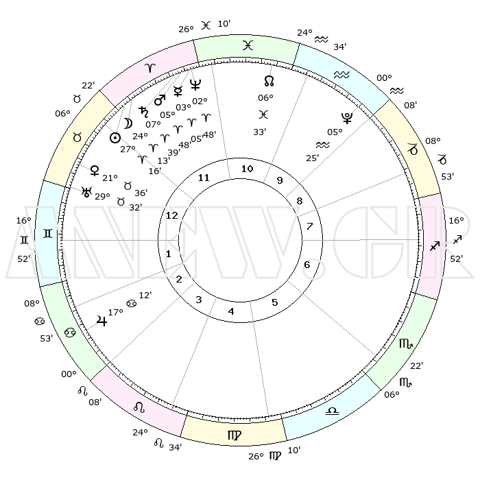 | | ΘΕΣΕΙΣ ΠΛΑΝΗΤΩΝ ΑΣΤΡΟΛΟΓΙΚΟΥ ΧΑΡΤΗ ΤΗΣ ΣΤΙΓΜΗΣ ΑΥΤΗΣ | | | | Πλανήτης | Ζώδιο | Μοίρες | Δεκαήμ. | Σε οίκο | Απόκλιση | | Ακμές των οίκων | | Ηλιος | Κριός | 27°11' | Τρίτο | 12 | 10 N 28 | | 1ος | 02°44' | Ταύρος | | Σελήνη | Κριός | 22°45' | Τρίτο | 12 | 12 N 12 | | 2ος | 04°12' | Δίδυμοι | | Ερμής | Κριός | 02°56' | Πρώτο | 12 | 01 S 15 | | 3ος | 27°29' | Δίδυμοι | | Αφροδίτη | Ταύρος | 21°29' | Τρίτο | 1 | 18 N 23 | | 4ος | 19°11' | Καρκίνος | | Αρης | Κριός | 05°43' | Πρώτο | 12 | 01 N 23 | | 5ος | 13°52' | Λέων | | Δίας | Καρκίνος | 17°12' | Δεύτερο | 3 | 22 N 42 | | 6ος | 17°07' | Παρθένος | | Κρόνος | Κριός | 07°39' | Πρώτο | 12 | 01 N 04 | | 7ος | 02°44' | Σκορπιός | | Ουρανός | Ταύρος | 29°32' | Τρίτο | 1 | 19 N 53 | | 8ος | 04°12' | Τοξότης | | Ποσειδώνας | Κριός | 02°48' | Πρώτο | 12 | 00 S 06 | | 9ος | 27°29' | Τοξότης | | Πλούτωνας | Υδροχόος | 05°25' | Πρώτο | 10 | 22 S 47 | | 10ος | 19°11' | Αιγόκερως | | Β. Δεσμός | Ιχθείς | 06°33' | Πρώτο | 11 | 09 S 06 | | 11ος | 13°52' | Υδροχόος | | Ωροσκόπος | Ταύρος | 02°44' | Πρώτο | | | 12ος | 17°07' | Ιχθείς | | Μεσουράνημα | Αιγόκερως | 19°11' | Δεύτερο | | | |
