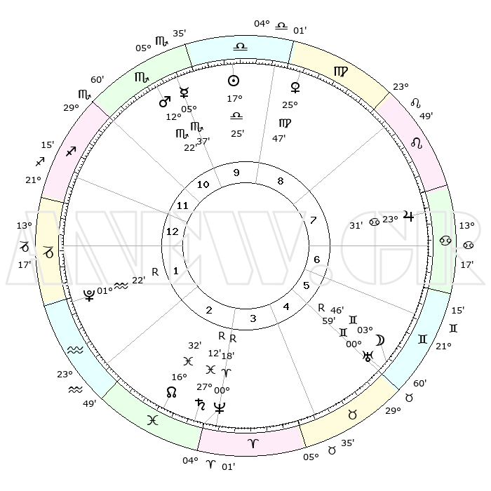 | ΘΕΣΕΙΣ ΠΛΑΝΗΤΩΝ ΑΣΤΡΟΛΟΓΙΚΟΥ ΧΑΡΤΗ ΤΗΣ ΣΤΙΓΜΗΣ ΑΥΤΗΣ | | Πλανήτης | Ζώδιο | Μοίρες | Δεκαήμ. | Σε οίκο | Απόκλιση | | Ακμές των οίκων | Ηλιος | Ζυγός | 17°08' | Δεύτερο | 1 | 06 S 44 | | 1ος | 17°08' | Ζυγός | Σελήνη | Ταύρος | 29°34' | Τρίτο | 8 | 24 N 53 | | 2ος | 14°48' | Σκορπιός | Ερμής | Σκορπιός | 05°12' | Πρώτο | 1 | 14 S 23 | | 3ος | 15°57' | Τοξότης | Αφροδίτη | Παρθένος | 25°26' | Τρίτο | 12 | 03 N 09 | | 4ος | 19°24' | Αιγόκερως | Αρης | Σκορπιός | 12°10' | Δεύτερο | 1 | 15 S 39 | | 5ος | 22°21' | Υδροχόος | Δίας | Καρκίνος | 23°29' | Τρίτο | 10 | 21 N 26 | | 6ος | 21°59' | Ιχθείς | Κρόνος | Ιχθείς | 27°13'R | Τρίτο | 6 | 03 S 24 | | 7ος | 17°08' | Κριός | Ουρανός | Δίδυμοι | 00°59'R | Πρώτο | 8 | 20 N 09 | | 8ος | 14°48' | Ταύρος | Ποσειδώνας | Κριός | 00°18'R | Πρώτο | 6 | 01 S 09 | | 9ος | 15°57' | Δίδυμοι | Πλούτωνας | Υδροχόος | 01°22'R | Πρώτο | 4 | 23 S 32 | | 10ος | 19°24' | Καρκίνος | Β. Δεσμός | Ιχθείς | 16°33' | Δεύτερο | 5 | 05 S 18 | | 11ος | 22°21' | Λέων | Ωροσκόπος | Ζυγός | 17°08' | Δεύτερο | | | 12ος | 21°59' | Παρθένος | Μεσουράνημα | Καρκίνος | 19°24' | Δεύτερο | | | |
