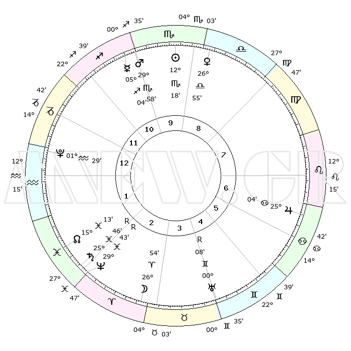 |  | ΘΕΣΕΙΣ ΠΛΑΝΗΤΩΝ ΑΣΤΡΟΛΟΓΙΚΟΥ ΧΑΡΤΗ ΤΗΣ ΣΤΙΓΜΗΣ ΑΥΤΗΣ |  |   |  | Πλανήτης | Ζώδιο | Μοίρες | Δεκαήμ. | Σε οίκο | Απόκλιση |   | Ακμές των οίκων |  | Ηλιος | Σκορπιός | 12°04' | Δεύτερο | 12 | 15 S 27 |   | 1ος | 20°55' | Σκορπιός |  | Σελήνη | Κριός | 23°20' | Τρίτο | 5 | 11 N 53 |   | 2ος | 20°57' | Τοξότης |  | Ερμής | Τοξότης | 04°55' | Πρώτο | 1 | 23 S 55 |   | 3ος | 25°14' | Αιγόκερως |  | Αφροδίτη | Ζυγός | 26°38' | Τρίτο | 11 | 08 S 56 |   | 4ος | 00°53' | Ιχθείς |  | Αρης | Σκορπιός | 29°48' | Τρίτο | 1 | 20 S 31 |   | 5ος | 02°53' | Κριός |  | Δίας | Καρκίνος | 25°04' | Τρίτο | 8 | 21 N 12 |   | 6ος | 29°10' | Κριός |  | Κρόνος | Ιχθείς | 25°47'R | Τρίτο | 4 | 03 S 56 |   | 7ος | 20°55' | Ταύρος |  | Ουρανός | Δίδυμοι | 00°09'R | Πρώτο | 7 | 19 N 58 |   | 8ος | 20°57' | Δίδυμοι |  | Ποσειδώνας | Ιχθείς | 29°44'R | Τρίτο | 4 | 01 S 22 |   | 9ος | 25°14' | Καρκίνος |  | Πλούτωνας | Υδροχόος | 01°29' | Πρώτο | 3 | 23 S 30 |   | 10ος | 00°53' | Παρθένος |  | Β. Δεσμός | Ιχθείς | 15°14' | Δεύτερο | 4 | 05 S 49 |   | 11ος | 02°53' | Ζυγός |  | Ωροσκόπος | Σκορπιός | 20°55' | Τρίτο |   |   | 12ος | 29°10' | Ζυγός |  | Μεσουράνημα | Παρθένος | 00°53' | Πρώτο |   |   |   |