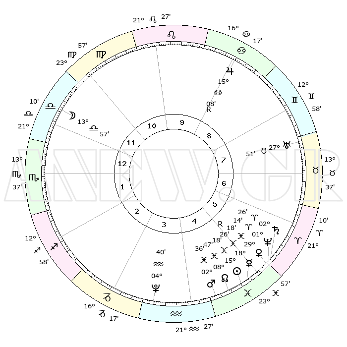 | | ΘΕΣΕΙΣ ΠΛΑΝΗΤΩΝ ΑΣΤΡΟΛΟΓΙΚΟΥ ΧΑΡΤΗ ΤΗΣ ΣΤΙΓΜΗΣ ΑΥΤΗΣ | | | | Πλανήτης | Ζώδιο | Μοίρες | Δεκαήμ. | Σε οίκο | Απόκλιση | | Ακμές των οίκων | | Ηλιος | Ιχθείς | 15°14' | Δεύτερο | 5 | 05 S 49 | | 1ος | 25°03' | Ζυγός | | Σελήνη | Ζυγός | 13°08' | Δεύτερο | 12 | 07 S 55 | | 2ος | 23°11' | Σκορπιός | | Ερμής | Ιχθείς | 18°29'R | Δεύτερο | 5 | 01 S 09 | | 3ος | 24°47' | Τοξότης | | Αφροδίτη | Ιχθείς | 29°13' | Τρίτο | 5 | 01 S 29 | | 4ος | 28°39' | Αιγόκερως | | Αρης | Ιχθείς | 02°33' | Πρώτο | 5 | 11 S 35 | | 5ος | 01°36' | Ιχθείς | | Δίας | Καρκίνος | 15°08'R | Δεύτερο | 9 | 22 N 55 | | 6ος | 00°41' | Κριός | | Κρόνος | Κριός | 02°25' | Πρώτο | 6 | 01 S 00 | | 7ος | 25°03' | Κριός | | Ουρανός | Ταύρος | 27°51' | Τρίτο | 8 | 19 N 30 | | 8ος | 23°11' | Ταύρος | | Ποσειδώνας | Κριός | 01°13' | Πρώτο | 6 | 00 S 43 | | 9ος | 24°47' | Δίδυμοι | | Πλούτωνας | Υδροχόος | 04°40' | Πρώτο | 4 | 22 S 51 | | 10ος | 28°39' | Καρκίνος | | Β. Δεσμός | Ιχθείς | 08°47' | Πρώτο | 5 | 08 S 16 | | 11ος | 01°36' | Παρθένος | | Ωροσκόπος | Ζυγός | 25°03' | Τρίτο | | | 12ος | 00°41' | Ζυγός | | Μεσουράνημα | Καρκίνος | 28°39' | Τρίτο | | | |