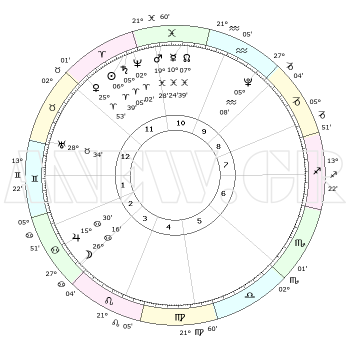 | | ΘΕΣΕΙΣ ΠΛΑΝΗΤΩΝ ΑΣΤΡΟΛΟΓΙΚΟΥ ΧΑΡΤΗ ΤΗΣ ΣΤΙΓΜΗΣ ΑΥΤΗΣ | | | | Πλανήτης | Ζώδιο | Μοίρες | Δεκαήμ. | Σε οίκο | Απόκλιση | | Ακμές των οίκων | | Ηλιος | Κριός | 06°37' | Πρώτο | 11 | 02 N 38 | | 1ος | 26°06' | Ταύρος | | Σελήνη | Καρκίνος | 25°41' | Τρίτο | 3 | 24 N 31 | | 2ος | 21°44' | Δίδυμοι | | Ερμής | Ιχθείς | 10°22' | Δεύτερο | 11 | 08 S 06 | | 3ος | 13°19' | Καρκίνος | | Αφροδίτη | Κριός | 25°50' | Τρίτο | 12 | 09 N 23 | | 4ος | 05°48' | Λέων | | Αρης | Ιχθείς | 19°26' | Δεύτερο | 11 | 05 S 09 | | 5ος | 03°37' | Παρθένος | | Δίας | Καρκίνος | 15°30' | Δεύτερο | 3 | 22 N 54 | | 6ος | 11°25' | Ζυγός | | Κρόνος | Κριός | 05°04' | Πρώτο | 11 | 00 N 04 | | 7ος | 26°06' | Σκορπιός | | Ουρανός | Ταύρος | 28°34' | Τρίτο | 1 | 19 N 40 | | 8ος | 21°44' | Τοξότης | | Ποσειδώνας | Κριός | 02°02' | Πρώτο | 11 | 00 S 24 | | 9ος | 13°19' | Αιγόκερως | | Πλούτωνας | Υδροχόος | 05°08' | Πρώτο | 9 | 22 S 48 | | 10ος | 05°48' | Υδροχόος | | Β. Δεσμός | Ιχθείς | 07°39' | Πρώτο | 11 | 08 S 42 | | 11ος | 03°37' | Ιχθείς | | Ωροσκόπος | Ταύρος | 26°06' | Τρίτο | | | 12ος | 11°25' | Κριός | | Μεσουράνημα | Υδροχόος | 05°48' | Πρώτο | | | |