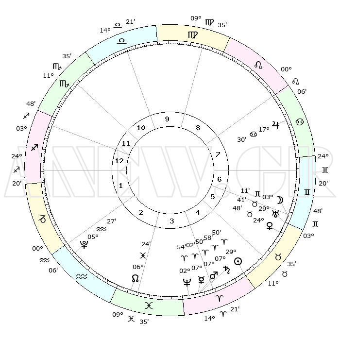 | | ΘΕΣΕΙΣ ΠΛΑΝΗΤΩΝ ΑΣΤΡΟΛΟΓΙΚΟΥ ΧΑΡΤΗ ΤΗΣ ΣΤΙΓΜΗΣ ΑΥΤΗΣ | | | | Πλανήτης | Ζώδιο | Μοίρες | Δεκαήμ. | Σε οίκο | Απόκλιση | | Ακμές των οίκων | | Ηλιος | Κριός | 29°47' | Τρίτο | 5 | 11 N 23 | | 1ος | 06°28' | Τοξότης | | Σελήνη | Δίδυμοι | 02°19' | Πρώτο | 6 | 25 N 36 | | 2ος | 08°34' | Αιγόκερως | | Ερμής | Κριός | 06°57' | Πρώτο | 4 | 00 N 21 | | 3ος | 15°22' | Υδροχόος | | Αφροδίτη | Ταύρος | 24°44' | Τρίτο | 6 | 19 N 20 | | 4ος | 21°27' | Ιχθείς | | Αρης | Κριός | 07°47' | Πρώτο | 4 | 02 N 13 | | 5ος | 21°36' | Κριός | | Δίας | Καρκίνος | 17°30' | Δεύτερο | 8 | 22 N 40 | | 6ος | 15°47' | Ταύρος | | Κρόνος | Κριός | 07°58' | Πρώτο | 4 | 01 N 11 | | 7ος | 06°28' | Δίδυμοι | | Ουρανός | Ταύρος | 29°40' | Τρίτο | 6 | 19 N 55 | | 8ος | 08°34' | Καρκίνος | | Ποσειδώνας | Κριός | 02°54' | Πρώτο | 4 | 00 S 03 | | 9ος | 15°22' | Λέων | | Πλούτωνας | Υδροχόος | 05°27' | Πρώτο | 2 | 22 S 48 | | 10ος | 21°27' | Παρθένος | | Β. Δεσμός | Ιχθείς | 06°24' | Πρώτο | 3 | 09 S 10 | | 11ος | 21°36' | Ζυγός | | Ωροσκόπος | Τοξότης | 06°28' | Πρώτο | | | 12ος | 15°47' | Σκορπιός | | Μεσουράνημα | Παρθένος | 21°27' | Τρίτο | | | |