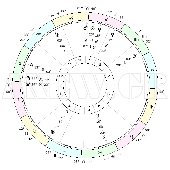 | | ΘΕΣΕΙΣ ΠΛΑΝΗΤΩΝ ΑΣΤΡΟΛΟΓΙΚΟΥ ΧΑΡΤΗ ΤΗΣ ΣΤΙΓΜΗΣ ΑΥΤΗΣ | | | | Πλανήτης | Ζώδιο | Μοίρες | Δεκαήμ. | Σε οίκο | Απόκλιση | | Ακμές των οίκων | | Ηλιος | Τοξότης | 22°57' | Τρίτο | 6 | 23 S 15 | | 1ος | 16°02' | Καρκίνος | | Σελήνη | Ζυγός | 24°30' | Τρίτο | 4 | 12 S 35 | | 2ος | 06°28' | Λέων | | Ερμής | Τοξότης | 03°32' | Πρώτο | 5 | 19 S 18 | | 3ος | 29°44' | Λέων | | Αφροδίτη | Τοξότης | 17°26' | Δεύτερο | 6 | 22 S 40 | | 4ος | 28°43' | Παρθένος | | Αρης | Τοξότης | 29°33' | Τρίτο | 6 | 24 S 12 | | 5ος | 04°30' | Σκορπιός | | Δίας | Καρκίνος | 23°24'R | Τρίτο | 1 | 21 N 36 | | 6ος | 12°33' | Τοξότης | | Κρόνος | Ιχθείς | 25°31' | Τρίτο | 9 | 03 S 54 | | 7ος | 16°01' | Αιγόκερως | | Ουρανός | Ταύρος | 28°30'R | Τρίτο | 11 | 19 N 38 | | 8ος | 06°28' | Υδροχόος | | Ποσειδώνας | Ιχθείς | 29°23' | Τρίτο | 10 | 01 S 29 | | 9ος | 29°44' | Υδροχόος | | Πλούτωνας | Υδροχόος | 02°14' | Πρώτο | 7 | 23 S 20 | | 10ος | 28°43' | Ιχθείς | | Β. Δεσμός | Ιχθείς | 13°05' | Δεύτερο | 9 | 06 S 39 | | 11ος | 04°30' | Ταύρος | | Ωροσκόπος | Καρκίνος | 16°02' | Δεύτερο | | | 12ος | 12°33' | Δίδυμοι | | Μεσουράνημα | Ιχθείς | 28°43' | Τρίτο | | | |