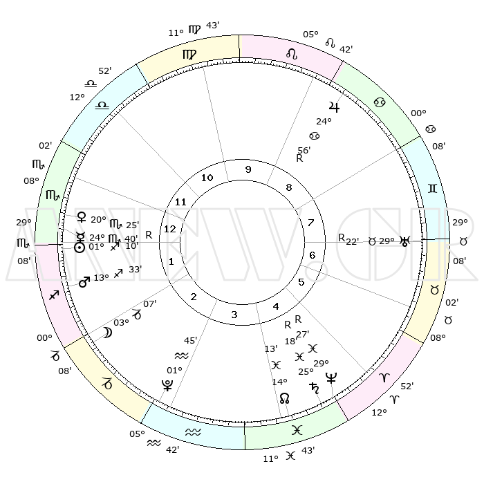 | | ΘΕΣΕΙΣ ΠΛΑΝΗΤΩΝ ΑΣΤΡΟΛΟΓΙΚΟΥ ΧΑΡΤΗ ΤΗΣ ΣΤΙΓΜΗΣ ΑΥΤΗΣ | | | | Πλανήτης | Ζώδιο | Μοίρες | Δεκαήμ. | Σε οίκο | Απόκλιση | | Ακμές των οίκων | | Ηλιος | Τοξότης | 01°06' | Πρώτο | 1 | 20 S 22 | | 1ος | 10°36' | Σκορπιός | | Σελήνη | Αιγόκερως | 02°21' | Πρώτο | 2 | 28 S 11 | | 2ος | 09°43' | Τοξότης | | Ερμής | Σκορπιός | 24°44'R | Τρίτο | 1 | 17 S 35 | | 3ος | 12°41' | Αιγόκερως | | Αφροδίτη | Σκορπιός | 20°21' | Τρίτο | 1 | 16 S 53 | | 4ος | 17°38' | Υδροχόος | | Αρης | Τοξότης | 13°31' | Δεύτερο | 2 | 23 S 00 | | 5ος | 20°17' | Ιχθείς | | Δίας | Καρκίνος | 24°56'R | Τρίτο | 9 | 21 N 16 | | 6ος | 17°51' | Κριός | | Κρόνος | Ιχθείς | 25°18'R | Τρίτο | 5 | 04 S 04 | | 7ος | 10°36' | Ταύρος | | Ουρανός | Ταύρος | 29°22'R | Τρίτο | 7 | 19 N 49 | | 8ος | 09°43' | Δίδυμοι | | Ποσειδώνας | Ιχθείς | 29°27'R | Τρίτο | 5 | 01 S 28 | | 9ος | 12°41' | Καρκίνος | | Πλούτωνας | Υδροχόος | 01°45' | Πρώτο | 3 | 23 S 26 | | 10ος | 17°38' | Λέων | | Β. Δεσμός | Ιχθείς | 14°14' | Δεύτερο | 4 | 06 S 12 | | 11ος | 20°17' | Παρθένος | | Ωροσκόπος | Σκορπιός | 10°36' | Δεύτερο | | | 12ος | 17°51' | Ζυγός | | Μεσουράνημα | Λέων | 17°38' | Δεύτερο | | | |