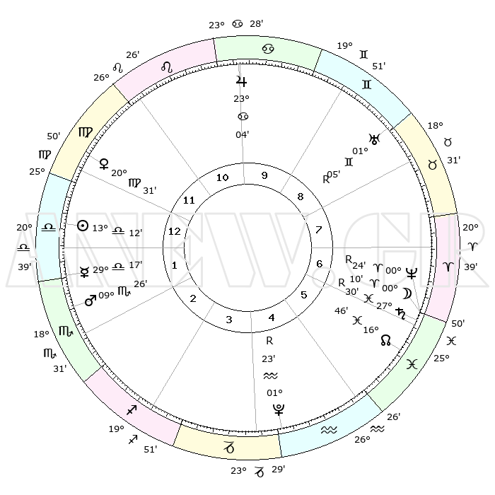 | ΘΕΣΕΙΣ ΠΛΑΝΗΤΩΝ ΑΣΤΡΟΛΟΓΙΚΟΥ ΧΑΡΤΗ ΤΗΣ ΣΤΙΓΜΗΣ ΑΥΤΗΣ | | Πλανήτης | Ζώδιο | Μοίρες | Δεκαήμ. | Σε οίκο | Απόκλιση | | Ακμές των οίκων | Ηλιος | Ζυγός | 13°07' | Δεύτερο | 1 | 05 S 11 | | 1ος | 22°26' | Παρθένος | Σελήνη | Ιχθείς | 28°46' | Τρίτο | 7 | 00 N 23 | | 2ος | 18°26' | Ζυγός | Ερμής | Ζυγός | 29°08' | Τρίτο | 2 | 11 S 50 | | 3ος | 18°33' | Σκορπιός | Αφροδίτη | Παρθένος | 20°24' | Τρίτο | 12 | 05 N 05 | | 4ος | 21°29' | Τοξότης | Αρης | Σκορπιός | 09°22' | Πρώτο | 2 | 14 S 44 | | 5ος | 24°36' | Αιγόκερως | Δίας | Καρκίνος | 23°04' | Τρίτο | 10 | 21 N 30 | | 6ος | 25°20' | Υδροχόος | Κρόνος | Ιχθείς | 27°30'R | Τρίτο | 7 | 03 S 18 | | 7ος | 22°26' | Ιχθείς | Ουρανός | Δίδυμοι | 01°06'R | Πρώτο | 9 | 20 N 10 | | 8ος | 18°26' | Κριός | Ποσειδώνας | Κριός | 00°24'R | Πρώτο | 7 | 01 S 06 | | 9ος | 18°33' | Ταύρος | Πλούτωνας | Υδροχόος | 01°23'R | Πρώτο | 5 | 23 S 32 | | 10ος | 21°29' | Δίδυμοι | Β. Δεσμός | Ιχθείς | 16°46' | Δεύτερο | 6 | 05 S 13 | | 11ος | 24°36' | Καρκίνος | Ωροσκόπος | Παρθένος | 22°26' | Τρίτο | | | 12ος | 25°20' | Λέων | Μεσουράνημα | Δίδυμοι | 21°29' | Τρίτο | | | |
