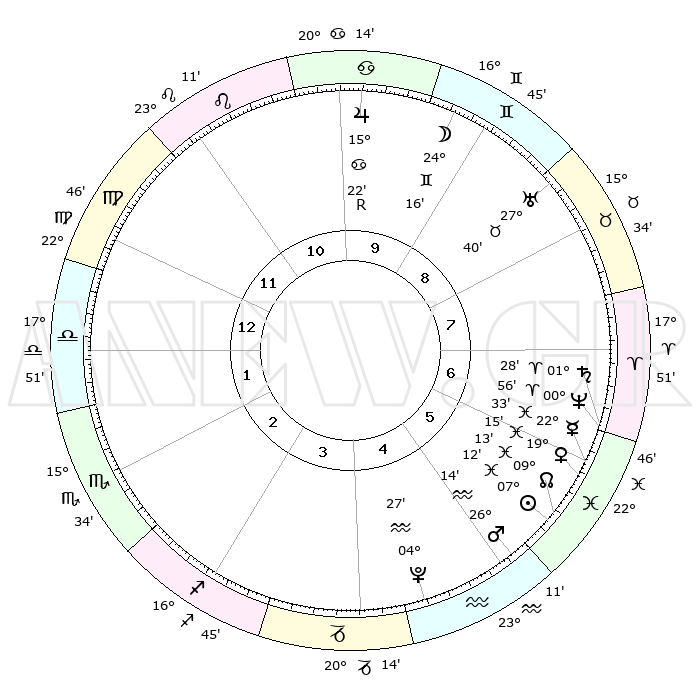 | | ΘΕΣΕΙΣ ΠΛΑΝΗΤΩΝ ΑΣΤΡΟΛΟΓΙΚΟΥ ΧΑΡΤΗ ΤΗΣ ΣΤΙΓΜΗΣ ΑΥΤΗΣ | | | | Πλανήτης | Ζώδιο | Μοίρες | Δεκαήμ. | Σε οίκο | Απόκλιση | | Ακμές των οίκων | | Ηλιος | Ιχθείς | 07°09' | Πρώτο | 6 | 08 S 53 | | 1ος | 28°38' | Παρθένος | | Σελήνη | Δίδυμοι | 23°21' | Τρίτο | 9 | 28 N 23 | | 2ος | 25°07' | Ζυγός | | Ερμής | Ιχθείς | 22°32' | Τρίτο | 6 | 00 S 30 | | 3ος | 25°30' | Σκορπιός | | Αφροδίτη | Ιχθείς | 19°10' | Δεύτερο | 6 | 05 S 35 | | 4ος | 28°27' | Τοξότης | | Αρης | Υδροχόος | 26°11' | Τρίτο | 5 | 13 S 49 | | 5ος | 01°27' | Υδροχόος | | Δίας | Καρκίνος | 15°23'R | Δεύτερο | 10 | 22 N 53 | | 6ος | 01°56' | Ιχθείς | | Κρόνος | Κριός | 01°27' | Πρώτο | 7 | 01 S 23 | | 7ος | 28°38' | Ιχθείς | | Ουρανός | Ταύρος | 27°40' | Τρίτο | 9 | 19 N 27 | | 8ος | 25°07' | Κριός | | Ποσειδώνας | Κριός | 00°56' | Πρώτο | 7 | 00 S 50 | | 9ος | 25°30' | Ταύρος | | Πλούτωνας | Υδροχόος | 04°27' | Πρώτο | 5 | 22 S 53 | | 10ος | 28°27' | Δίδυμοι | | Β. Δεσμός | Ιχθείς | 09°13' | Πρώτο | 6 | 08 S 07 | | 11ος | 01°27' | Λέων | | Ωροσκόπος | Παρθένος | 28°38' | Τρίτο | | | 12ος | 01°56' | Παρθένος | | Μεσουράνημα | Δίδυμοι | 28°27' | Τρίτο | | | |