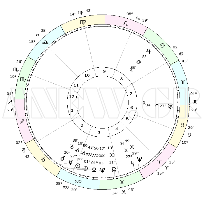 | | ΘΕΣΕΙΣ ΠΛΑΝΗΤΩΝ ΑΣΤΡΟΛΟΓΙΚΟΥ ΧΑΡΤΗ ΤΗΣ ΣΤΙΓΜΗΣ ΑΥΤΗΣ | | | | Πλανήτης | Ζώδιο | Μοίρες | Δεκαήμ. | Σε οίκο | Απόκλιση | | Ακμές των οίκων | | Ηλιος | Αιγόκερως | 28°55' | Τρίτο | 3 | 20 S 22 | | 1ος | 12°02' | Σκορπιός | | Σελήνη | Υδροχόος | 00°53' | Πρώτο | 3 | 23 S 06 | | 2ος | 11°16' | Τοξότης | | Ερμής | Αιγόκερως | 27°12' | Τρίτο | 3 | 22 S 39 | | 3ος | 14°23' | Αιγόκερως | | Αφροδίτη | Υδροχόος | 01°51' | Πρώτο | 3 | 20 S 48 | | 4ος | 19°27' | Υδροχόος | | Αρης | Αιγόκερως | 26°36' | Τρίτο | 3 | 21 S 48 | | 5ος | 22°01' | Ιχθείς | | Δίας | Καρκίνος | 18°57'R | Δεύτερο | 9 | 22 N 22 | | 6ος | 19°26' | Κριός | | Κρόνος | Ιχθείς | 27°34' | Τρίτο | 5 | 02 S 59 | | 7ος | 12°02' | Ταύρος | | Ουρανός | Ταύρος | 27°34'R | Τρίτο | 7 | 19 N 25 | | 8ος | 11°16' | Δίδυμοι | | Ποσειδώνας | Ιχθείς | 29°49' | Τρίτο | 5 | 01 S 17 | | 9ος | 14°23' | Καρκίνος | | Πλούτωνας | Υδροχόος | 03°17' | Πρώτο | 3 | 23 S 06 | | 10ος | 19°27' | Λέων | | Β. Δεσμός | Ιχθείς | 11°13' | Δεύτερο | 4 | 07 S 21 | | 11ος | 22°02' | Παρθένος | | Ωροσκόπος | Σκορπιός | 12°02' | Δεύτερο | | | 12ος | 19°26' | Ζυγός | | Μεσουράνημα | Λέων | 19°27' | Δεύτερο | | | |