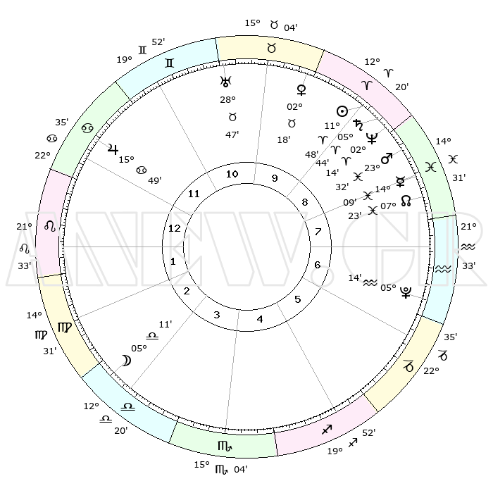 | | ΘΕΣΕΙΣ ΠΛΑΝΗΤΩΝ ΑΣΤΡΟΛΟΓΙΚΟΥ ΧΑΡΤΗ ΤΗΣ ΣΤΙΓΜΗΣ ΑΥΤΗΣ | | | | Πλανήτης | Ζώδιο | Μοίρες | Δεκαήμ. | Σε οίκο | Απόκλιση | | Ακμές των οίκων | | Ηλιος | Κριός | 11°44' | Δεύτερο | 9 | 04 N 38 | | 1ος | 01°37' | Λέων | | Σελήνη | Ζυγός | 04°19' | Πρώτο | 3 | 03 S 47 | | 2ος | 22°46' | Λέων | | Ερμής | Ιχθείς | 14°06' | Δεύτερο | 8 | 07 S 32 | | 3ος | 18°02' | Παρθένος | | Αφροδίτη | Ταύρος | 02°13' | Πρώτο | 10 | 11 N 50 | | 4ος | 19°16' | Ζυγός | | Αρης | Ιχθείς | 23°29' | Τρίτο | 9 | 03 S 33 | | 5ος | 25°16' | Σκορπιός | | Δίας | Καρκίνος | 15°49' | Δεύτερο | 12 | 22 N 52 | | 6ος | 00°42' | Αιγόκερως | | Κρόνος | Κριός | 05°43' | Πρώτο | 9 | 00 N 19 | | 7ος | 01°37' | Υδροχόος | | Ουρανός | Ταύρος | 28°47' | Τρίτο | 11 | 19 N 43 | | 8ος | 22°46' | Υδροχόος | | Ποσειδώνας | Κριός | 02°14' | Πρώτο | 9 | 00 S 19 | | 9ος | 18°02' | Ιχθείς | | Πλούτωνας | Υδροχόος | 05°14' | Πρώτο | 7 | 22 S 47 | | 10ος | 19°16' | Κριός | | Β. Δεσμός | Ιχθείς | 07°23' | Πρώτο | 8 | 08 S 48 | | 11ος | 25°16' | Ταύρος | | Ωροσκόπος | Λέων | 01°37' | Πρώτο | | | 12ος | 00°42' | Καρκίνος | | Μεσουράνημα | Κριός | 19°16' | Δεύτερο | | | |