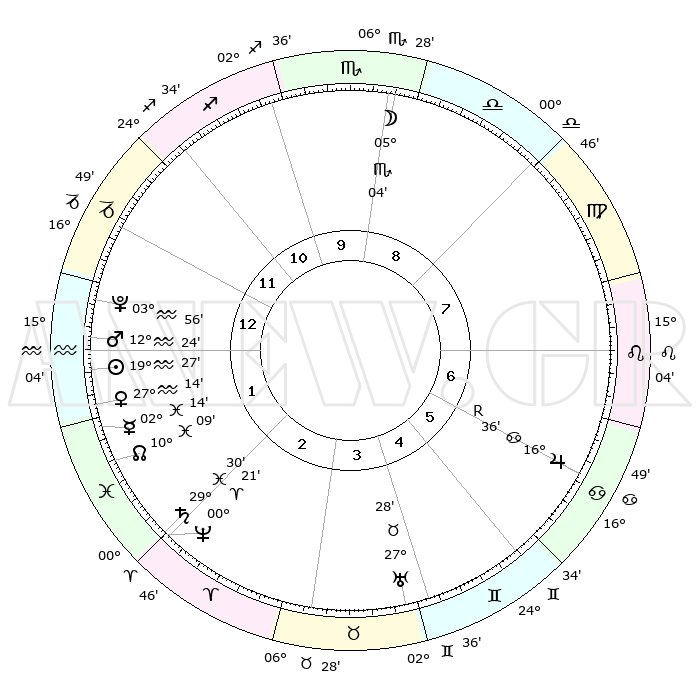 | | ΘΕΣΕΙΣ ΠΛΑΝΗΤΩΝ ΑΣΤΡΟΛΟΓΙΚΟΥ ΧΑΡΤΗ ΤΗΣ ΣΤΙΓΜΗΣ ΑΥΤΗΣ | | | | Πλανήτης | Ζώδιο | Μοίρες | Δεκαήμ. | Σε οίκο | Απόκλιση | | Ακμές των οίκων | | Ηλιος | Υδροχόος | 19°22' | Δεύτερο | 1 | 15 S 00 | | 1ος | 14°15' | Αιγόκερως | | Σελήνη | Σκορπιός | 04°11' | Πρώτο | 9 | 16 S 58 | | 2ος | 25°01' | Υδροχόος | | Ερμής | Ιχθείς | 02°06' | Πρώτο | 2 | 11 S 50 | | 3ος | 05°10' | Κριός | | Αφροδίτη | Υδροχόος | 27°09' | Τρίτο | 2 | 13 S 49 | | 4ος | 06°33' | Ταύρος | | Αρης | Υδροχόος | 12°20' | Δεύτερο | 1 | 18 S 07 | | 5ος | 00°51' | Δίδυμοι | | Δίας | Καρκίνος | 16°37'R | Δεύτερο | 7 | 22 N 43 | | 6ος | 22°05' | Δίδυμοι | | Κρόνος | Ιχθείς | 29°29' | Τρίτο | 2 | 02 S 11 | | 7ος | 14°15' | Καρκίνος | | Ουρανός | Ταύρος | 27°28' | Τρίτο | 4 | 19 N 24 | | 8ος | 25°01' | Λέων | | Ποσειδώνας | Κριός | 00°21' | Πρώτο | 2 | 01 S 04 | | 9ος | 05°10' | Ζυγός | | Πλούτωνας | Υδροχόος | 03°56' | Πρώτο | 1 | 22 S 59 | | 10ος | 06°33' | Σκορπιός | | Β. Δεσμός | Ιχθείς | 10°09' | Δεύτερο | 2 | 07 S 46 | | 11ος | 00°51' | Τοξότης | | Ωροσκόπος | Αιγόκερως | 14°15' | Δεύτερο | | | 12ος | 22°05' | Τοξότης | | Μεσουράνημα | Σκορπιός | 06°33' | Πρώτο | | | |