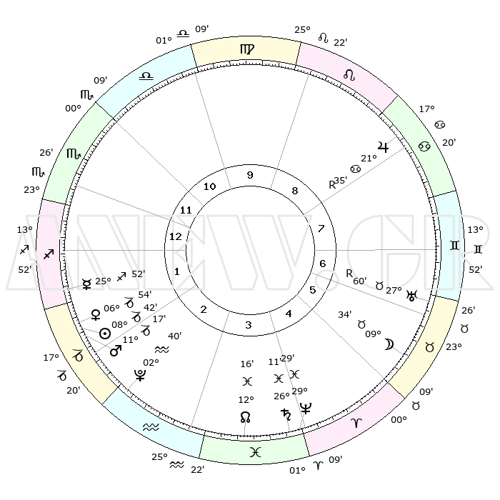 | | ΘΕΣΕΙΣ ΠΛΑΝΗΤΩΝ ΑΣΤΡΟΛΟΓΙΚΟΥ ΧΑΡΤΗ ΤΗΣ ΣΤΙΓΜΗΣ ΑΥΤΗΣ | | | | Πλανήτης | Ζώδιο | Μοίρες | Δεκαήμ. | Σε οίκο | Απόκλιση | | Ακμές των οίκων | | Ηλιος | Αιγόκερως | 08°37' | Πρώτο | 2 | 23 S 09 | | 1ος | 20°33' | Σκορπιός | | Σελήνη | Ταύρος | 08°25' | Πρώτο | 6 | 18 N 21 | | 2ος | 20°33' | Τοξότης | | Ερμής | Τοξότης | 25°45' | Τρίτο | 2 | 23 S 43 | | 3ος | 24°46' | Αιγόκερως | | Αφροδίτη | Αιγόκερως | 06°48' | Πρώτο | 2 | 23 S 41 | | 4ος | 00°25' | Ιχθείς | | Αρης | Αιγόκερως | 11°14' | Δεύτερο | 2 | 23 S 50 | | 5ος | 02°26' | Κριός | | Δίας | Καρκίνος | 21°36'R | Τρίτο | 8 | 21 N 56 | | 6ος | 28°46' | Κριός | | Κρόνος | Ιχθείς | 26°11' | Τρίτο | 4 | 03 S 36 | | 7ος | 20°33' | Ταύρος | | Ουρανός | Ταύρος | 27°60'R | Τρίτο | 7 | 19 N 31 | | 8ος | 20°33' | Δίδυμοι | | Ποσειδώνας | Ιχθείς | 29°29' | Τρίτο | 4 | 01 S 26 | | 9ος | 24°47' | Καρκίνος | | Πλούτωνας | Υδροχόος | 02°40' | Πρώτο | 3 | 23 S 14 | | 10ος | 00°25' | Παρθένος | | Β. Δεσμός | Ιχθείς | 12°16' | Δεύτερο | 4 | 06 S 57 | | 11ος | 02°26' | Ζυγός | | Ωροσκόπος | Σκορπιός | 20°33' | Τρίτο | | | 12ος | 28°46' | Ζυγός | | Μεσουράνημα | Παρθένος | 00°25' | Πρώτο | | | |