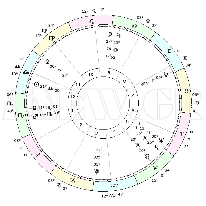 | ΘΕΣΕΙΣ ΠΛΑΝΗΤΩΝ ΑΣΤΡΟΛΟΓΙΚΟΥ ΧΑΡΤΗ ΤΗΣ ΣΤΙΓΜΗΣ ΑΥΤΗΣ | | Πλανήτης | Ζώδιο | Μοίρες | Δεκαήμ. | Σε οίκο | Απόκλιση | | Ακμές των οίκων | Ηλιος | Ζυγός | 19°56' | Δεύτερο | 2 | 07 S 48 | | 1ος | 00°33' | Παρθένος | Σελήνη | Καρκίνος | 10°31' | Δεύτερο | 11 | 27 N 49 | | 2ος | 24°28' | Παρθένος | Ερμής | Σκορπιός | 09°17' | Πρώτο | 3 | 16 S 01 | | 3ος | 23°11' | Ζυγός | Αφροδίτη | Παρθένος | 28°56' | Τρίτο | 2 | 01 N 48 | | 4ος | 26°07' | Σκορπιός | Αρης | Σκορπιός | 14°08' | Δεύτερο | 3 | 16 S 16 | | 5ος | 00°16' | Αιγόκερως | Δίας | Καρκίνος | 23°45' | Τρίτο | 11 | 21 N 23 | | 6ος | 02°11' | Υδροχόος | Κρόνος | Ιχθείς | 27°01'R | Τρίτο | 8 | 03 S 29 | | 7ος | 00°33' | Ιχθείς | Ουρανός | Δίδυμοι | 00°55'R | Πρώτο | 10 | 20 N 08 | | 8ος | 24°28' | Ιχθείς | Ποσειδώνας | Κριός | 00°14'R | Πρώτο | 8 | 01 S 10 | | 9ος | 23°11' | Κριός | Πλούτωνας | Υδροχόος | 01°22'R | Πρώτο | 5 | 23 S 32 | | 10ος | 26°07' | Ταύρος | Β. Δεσμός | Ιχθείς | 16°24' | Δεύτερο | 7 | 05 S 22 | | 11ος | 00°16' | Καρκίνος | Ωροσκόπος | Παρθένος | 00°33' | Πρώτο | | | 12ος | 02°11' | Λέων | Μεσουράνημα | Ταύρος | 26°07' | Τρίτο | | | |