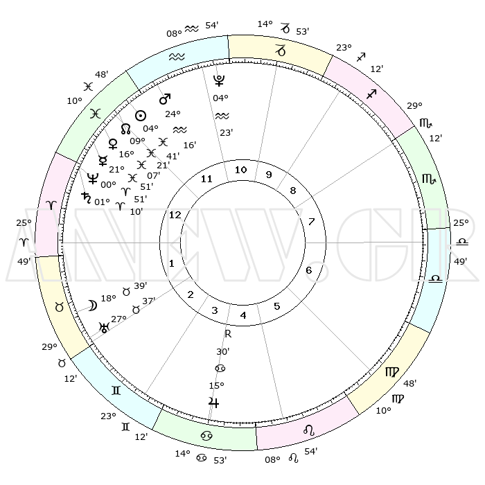 | | ΘΕΣΕΙΣ ΠΛΑΝΗΤΩΝ ΑΣΤΡΟΛΟΓΙΚΟΥ ΧΑΡΤΗ ΤΗΣ ΣΤΙΓΜΗΣ ΑΥΤΗΣ | | | | Πλανήτης | Ζώδιο | Μοίρες | Δεκαήμ. | Σε οίκο | Απόκλιση | | Ακμές των οίκων | | Ηλιος | Ιχθείς | 04°36' | Πρώτο | 12 | 09 S 49 | | 1ος | 10°46' | Ιχθείς | | Σελήνη | Ταύρος | 17°33' | Δεύτερο | 2 | 21 N 47 | | 2ος | 24°56' | Κριός | | Ερμής | Ιχθείς | 21°48' | Τρίτο | 1 | 01 S 21 | | 3ος | 25°35' | Ταύρος | | Αφροδίτη | Ιχθείς | 16°01' | Δεύτερο | 1 | 06 S 50 | | 4ος | 19°03' | Δίδυμοι | | Αρης | Υδροχόος | 24°12' | Τρίτο | 12 | 14 S 29 | | 5ος | 10°47' | Καρκίνος | | Δίας | Καρκίνος | 15°30'R | Δεύτερο | 5 | 22 N 52 | | 6ος | 05°33' | Λέων | | Κρόνος | Κριός | 01°10' | Πρώτο | 1 | 01 S 30 | | 7ος | 10°46' | Παρθένος | | Ουρανός | Ταύρος | 27°37' | Τρίτο | 3 | 19 N 27 | | 8ος | 24°56' | Ζυγός | | Ποσειδώνας | Κριός | 00°51' | Πρώτο | 1 | 00 S 52 | | 9ος | 25°35' | Σκορπιός | | Πλούτωνας | Υδροχόος | 04°23' | Πρώτο | 11 | 22 S 54 | | 10ος | 19°03' | Τοξότης | | Β. Δεσμός | Ιχθείς | 09°21' | Πρώτο | 12 | 08 S 04 | | 11ος | 10°47' | Αιγόκερως | | Ωροσκόπος | Ιχθείς | 10°46' | Δεύτερο | | | 12ος | 05°33' | Υδροχόος | | Μεσουράνημα | Τοξότης | 19°03' | Δεύτερο | | | |